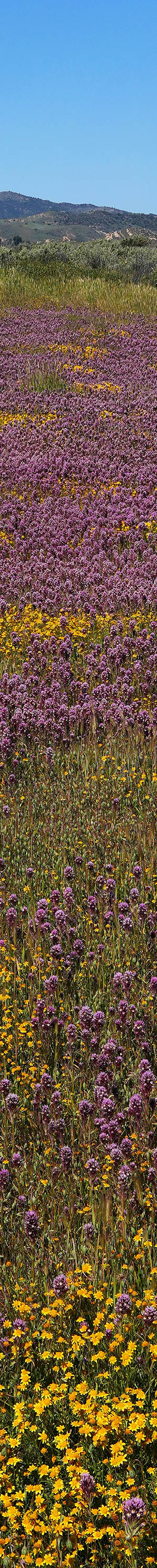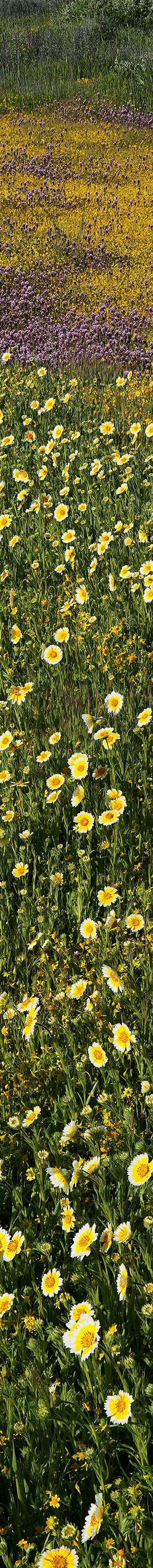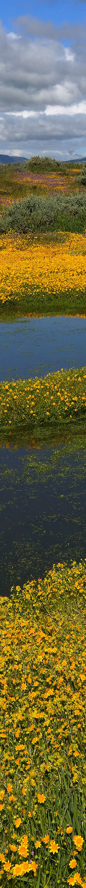 After working a couple more modest pond subjects, at 9:48am found the above dense expanse of California goldfields surrounding a freshly flooded shallow pond with purple owl's clover and saltbush in the back and nice clouds over the low mountains west. The zone has slightly undulating terrain ponds form within that are difficult to see from distances. I was able to capture a good 2 frame stitch reflection before the growing breeze became impossible. Note the green grasses under the shallow water, indicating before the storm at my arrival, the pond was likely near dry. So my timing was optimal.