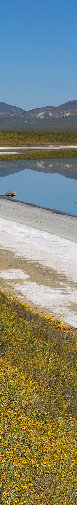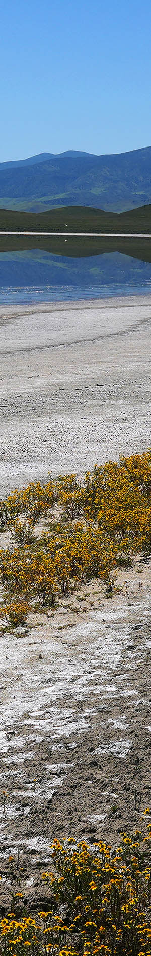 It was unusually dead calm that did allow a reflection of Soda Lake southward from a section of shoreline that juts out east a bit. A rather short off trails walk from paved Soda Lake Road few others bother to investigate. The water level was rather low with bright white alkaline flats covering most of the full lake's basin. At page top at 11:25am worked that strong 2 column horizontal stitch subject in a dramatically clear dry atmosphere. In the far distance at frame right within superb blue sky Rayleigh scattering is snow on the 8000+ foot Coast Range mountains to the south. At frame right, sections of the much closer still nicely green Caliente Range also reflect in the dead calm waters. Sun bleached going to seed goldfields line the shore. At this time of early spring, landscapes viewed south or northward are usually not too harsh even at mid day.
