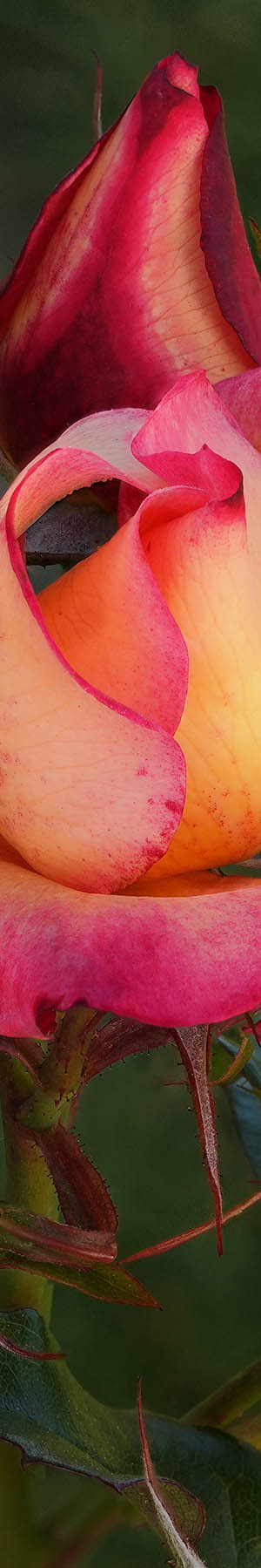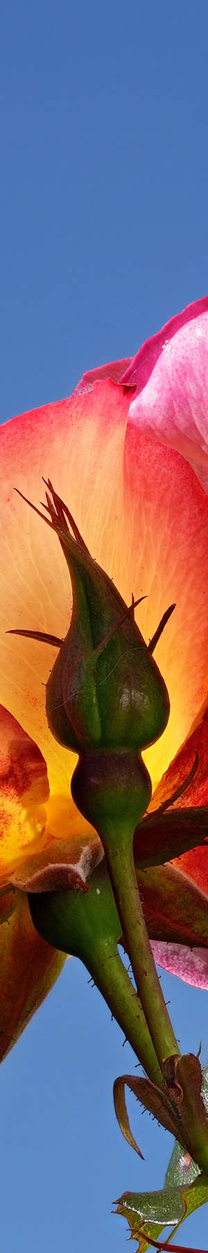 Cultivar name: Rainbow Sorbet. Floribunda with deep pink, yellow edges. Mild, sweet fragrance. 18 petals. Average diameter 3.5". Continuous (perpetual) bloom throughout the season. Pointed, ovoid buds. Edged in deep pink, this golden yellow beauty blooms early and abundantly and continues all season long. Remarkable disease-resistance and very winter hardy. Medium green foliage. Height of 4' to 5' (120 to 150 cm).
