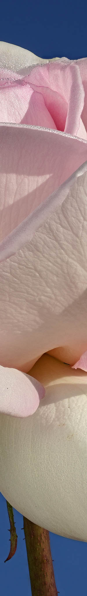 One of my best white rose images with excellent shape a Pink Promise cultivar rose. This was a large bloom and slightly wet at SJMRG plot 95. Lens looking up into blue sky.