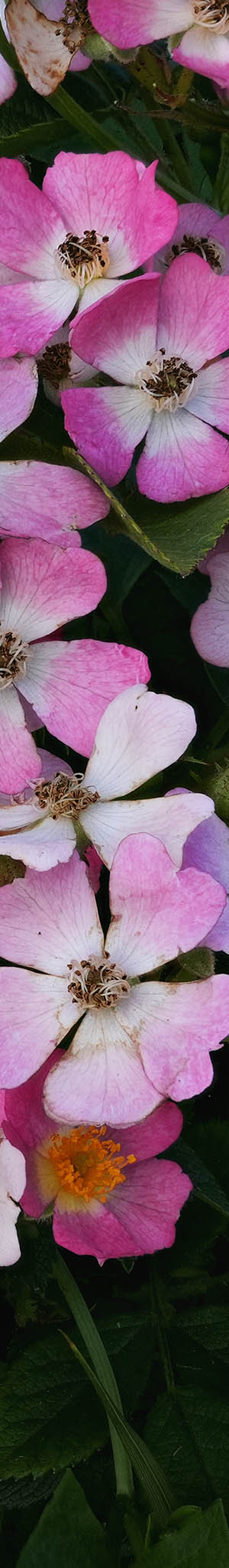 Cultivar name: Phloxy Baby. Pink blend Polyantha. Polyantha. Pink, white shading, ages to light pink. No fragrance. 5 petals. Average diameter 0.75". Small, single (4-8 petals), in small clusters bloom form. Prolific, continuous (perpetual) bloom throughout the season. Small, ovoid buds. Bushy, upright. Glossy, medium green foliage. 3 to 7 leaflets. Height of 5.5' (165 cm). Width of 4' to 5' (120 to 150 cm).