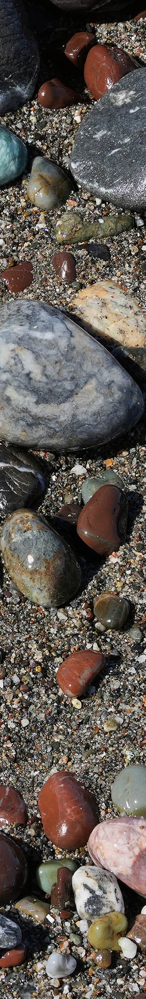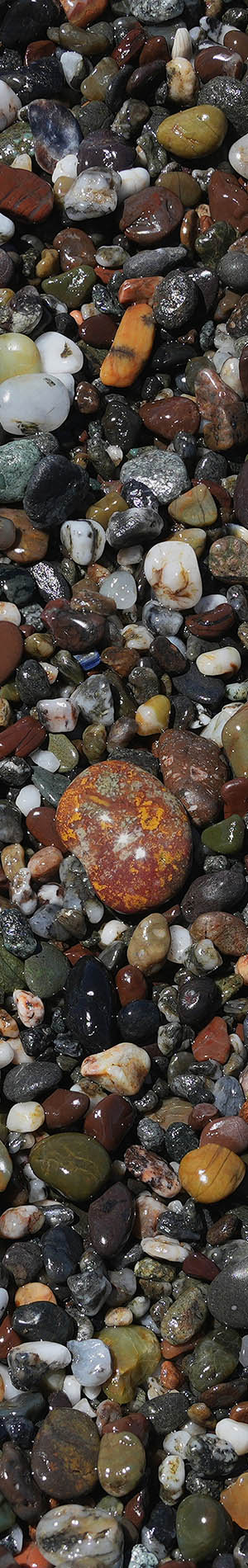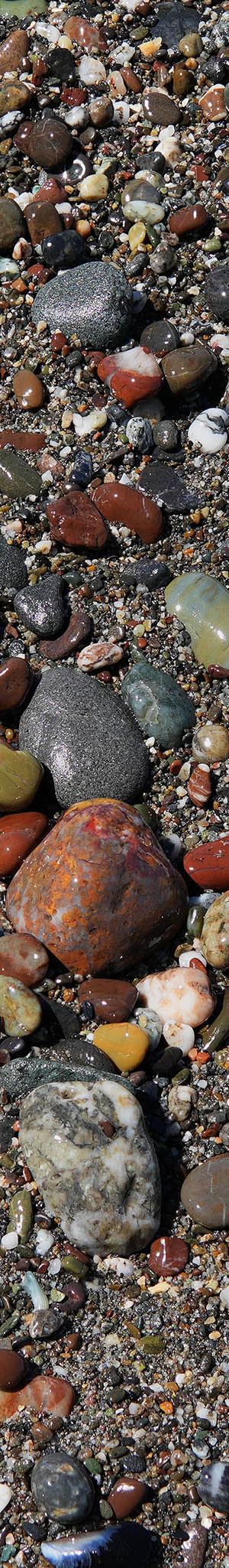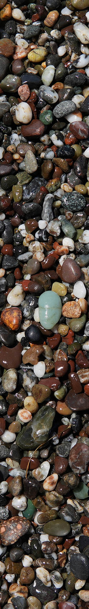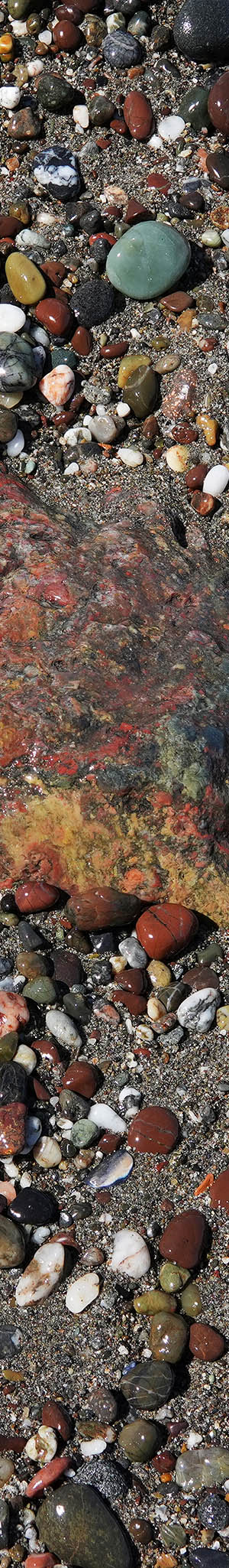 There are many beaches along the Pacic Ocean coast with surf smoothed stone cobbles and pebbles. However, few such stony beaches have multi-colored stones that requires uncommon geologies at nearby shore bluff areas they erode out from. I've been occasionally photographing these multi-colored beach stone subjects for nearly 3 decades, so have a sizeable body of this work. However few of those images have ever been presented on my public web site in part to keep these locations out of the public's awareness. Of course, many beachcombing people might collect such natural beauties that over years would denude these beaches of better stones much like has happened at Glass Beach in Fort Bragg.