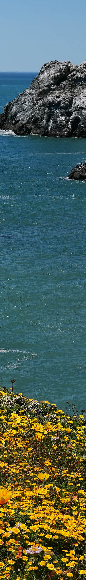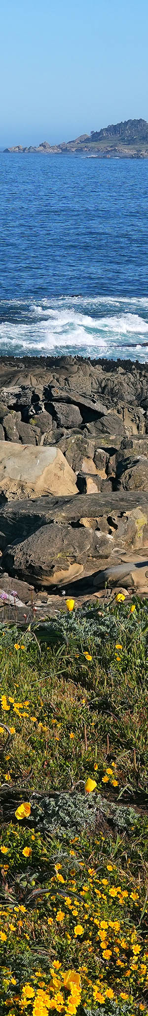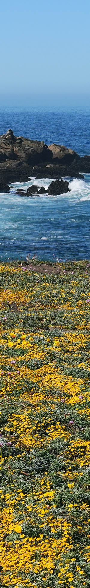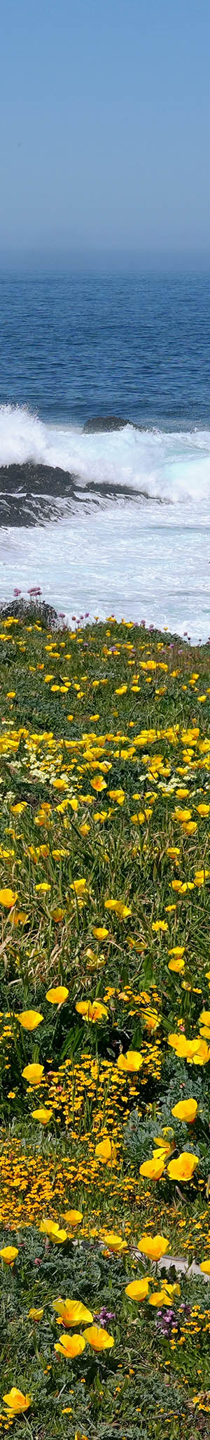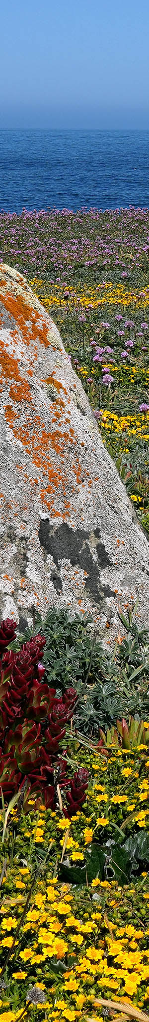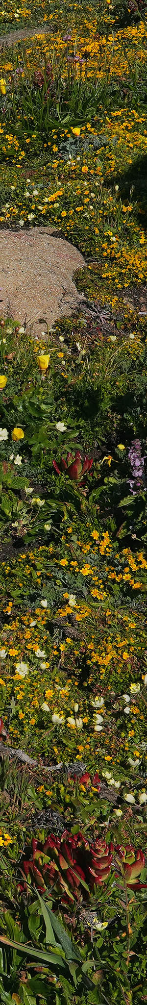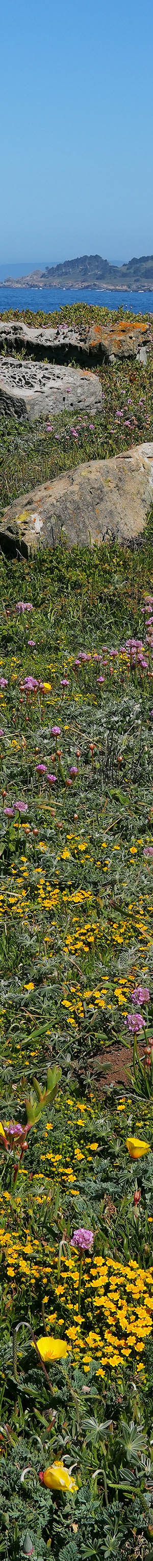At 10:24am with an optimal sun altitude for best light and flowers now fully open, a 3 column 1 row seascape panorama stitch blend expanse of California goldfields, sea thrift, California poppy, tafoni sandstone with lichen.