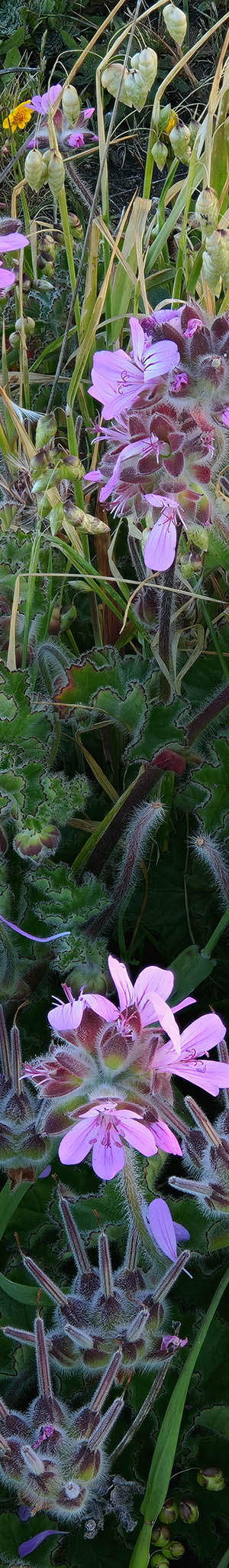 Per above image, at one hill was this grapeleaf geranium, pelargonium vitifolium, a southern Africa native plant, that required several attempts during breeze lulls before capturing a bracket set that stayed dead calm long enough. This type of subject sharp to the ground frame edge to edge, would be impossible to post process without in camera focus bracketing capture due to many elements with significant parallax. Especially impossible to fix is parallax in back of tiny plant stem and leaf hairs. In Zerene Stacker, manual processing would also be impossible so used the automated Pmax output that required several seconds of dead calm while my a6700 cranked through 34 shots. Note the detail of fine hairs and dangling rattlesnake grass (alien) seedheads that in breezes shake making a slight sound like rattlesnake rattles.