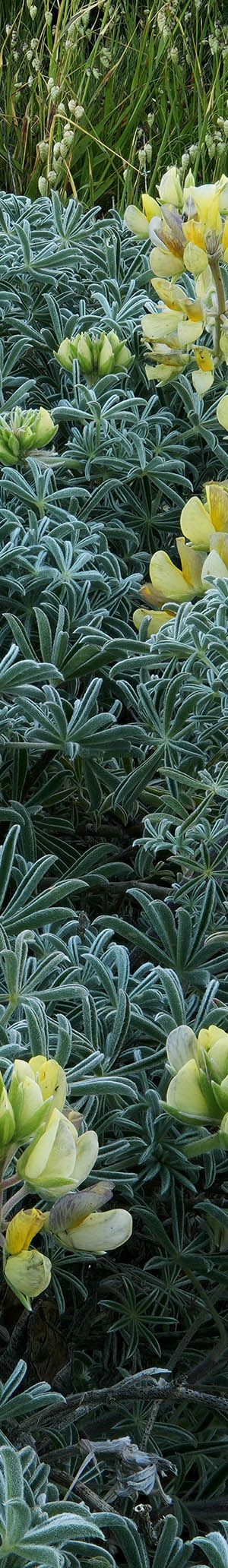 Across the top of fragrant yellow bush lupine, lupinis arboreaus, with rattlesnake grasses behind. The colorful species was originally only native as far north as San Mateo County but has spread along shores as far north as Oregon. Leaves and stems are covered by tiny white hairs that give the cyan green color a unique white glow.