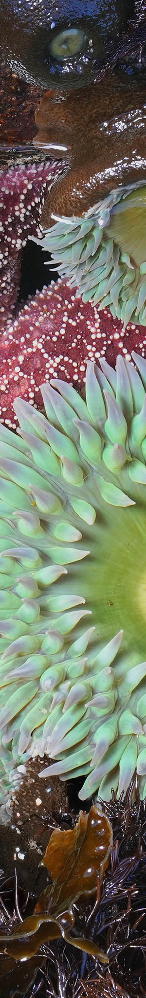May 10 had a minus 1.0 foot low tide, so spent some time carefully climbing about down within the extremely slippery lower seawater boulders while keeping an eye out for occasional large waves. This subject required an awkward Benbo tripod set up allowing my lens to peer down between boulders. Giant green anemone, anthopleura xanthogrammica, ochre sea star, pisaster ochraceus (starfish), brown seaweed. Also a few purple spines from hidden sea urchin poking through seaweed. The camera rattled off 35 focus bracket shots at F5.0 to capture this subject. On Internet lens test sites, F4.0 through F5.6 are my Sigma 30mm and 56mm DC DN lens sharpest apertures.