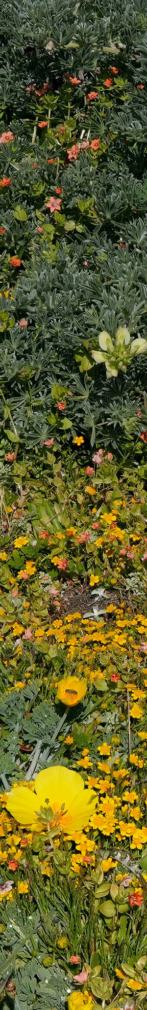 Intimate subject with much fine detail, a bit inland with bluff California goldfields, scarlet pimpernel, California poppy, in front of a yellow bush lupine. Early mornings, one will often see little cottontail rabbits about these coastal bluff gardens.