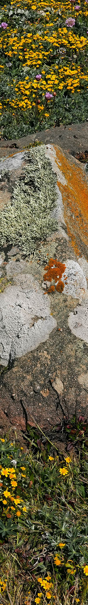 California goldfields and sea thrift surround a sandstone boulder embedded in bluff soils with colorful lichen.