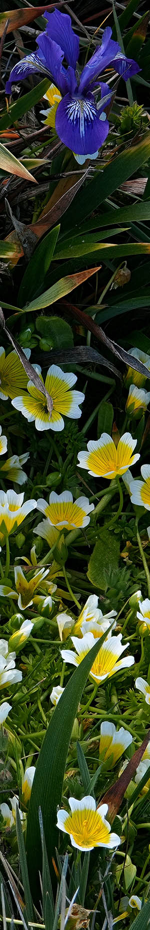 Close-up of coastal tidy tips, layia platyglossa, and 3 Douglas iris, iris douglasiana. The large showy iris densely colonize in patches at wetter bluff areas.