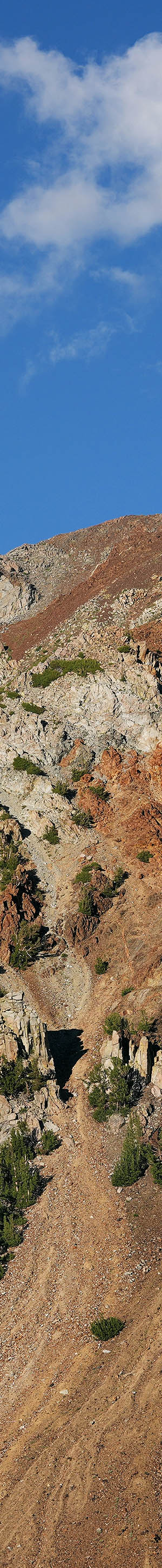 By 5:30pm I had located the best nearby location without blocking pines to shoot rusty red metamorphic sedimentary 12374 foot Dunderberg Peak, the main subject for late afternoons. There, I worked the above single frame landscape requiring 9 focus bracket shots. The peak has the same geology as the East Lake area while the colorful peaks and canyon further west are extrusive igneous rock.