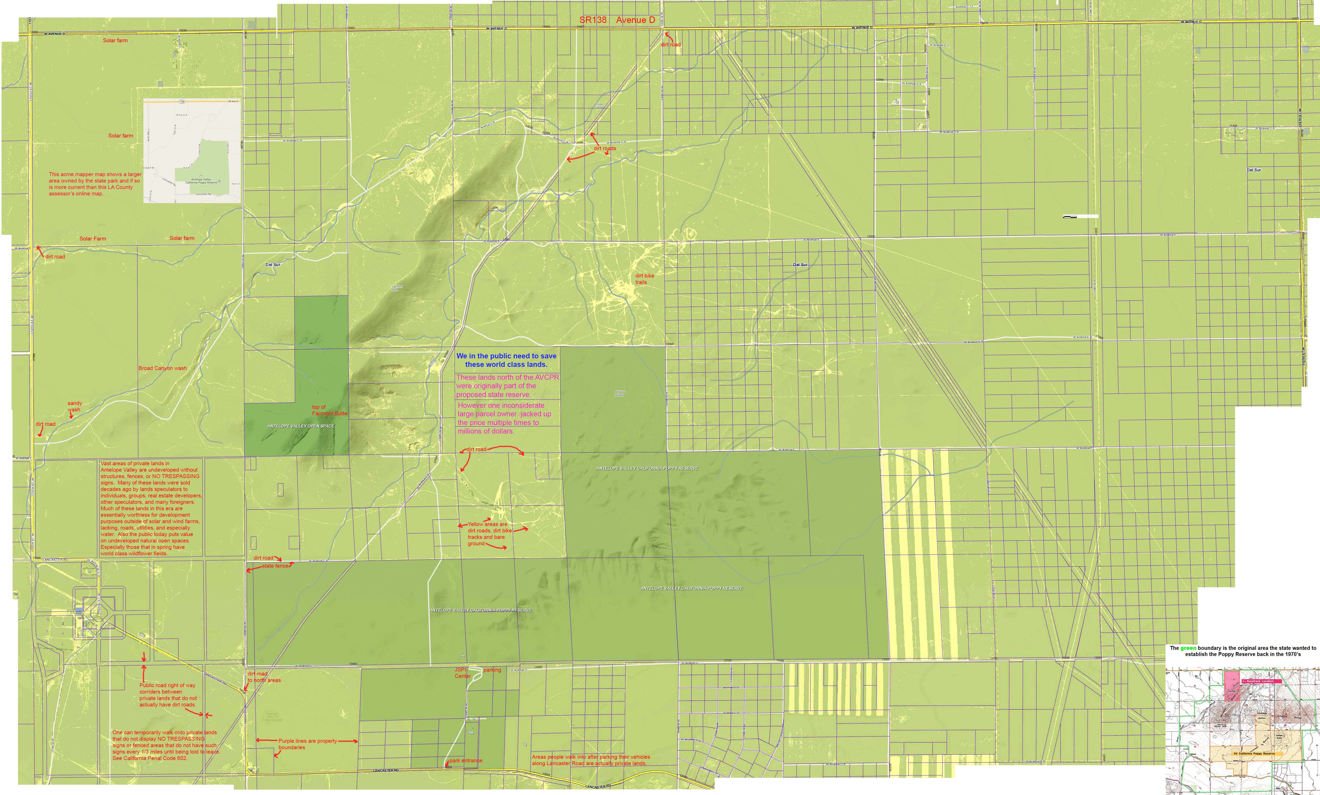 The below links to a larger detailed map I created from the Los Angeles County Assessor online map showing private land boundaries in the AVCPR area. See the inset map top left in the below link.