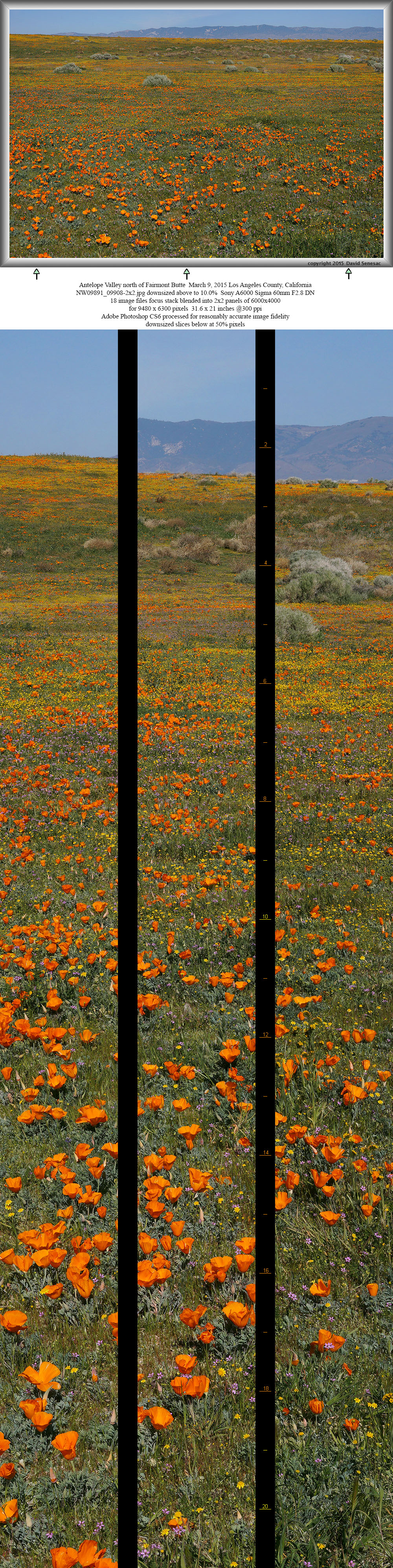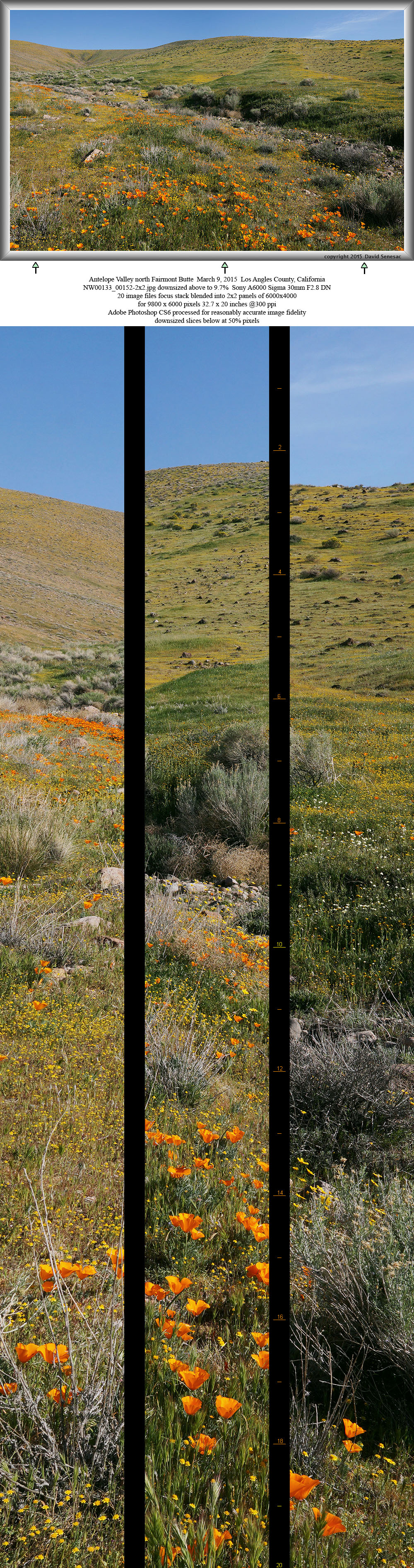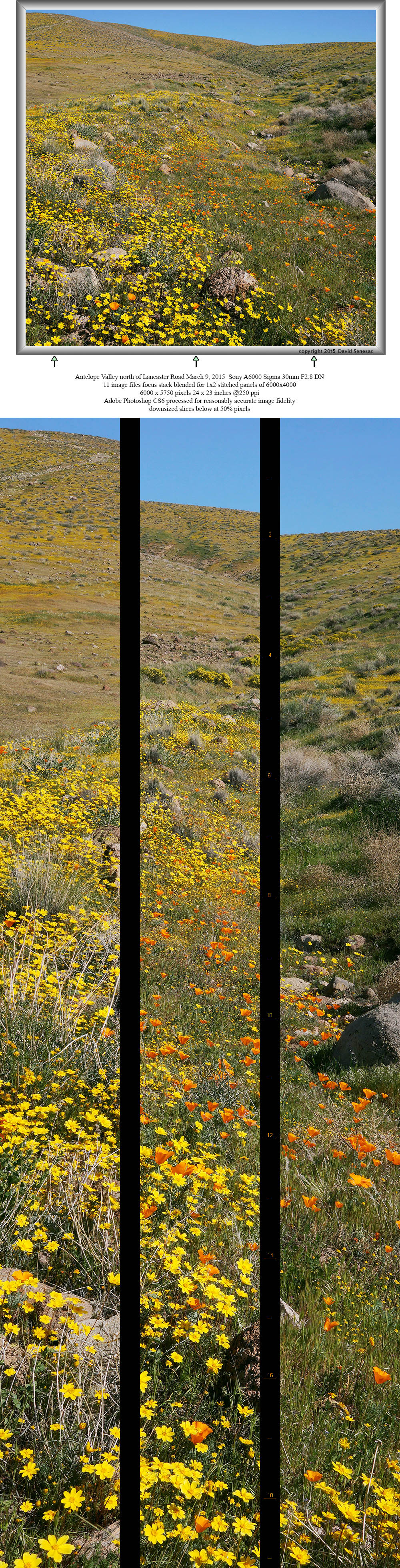 Five minutes later completed another 2x2 panel above from nearby to the southwest. The foreground is similar to the previous image but the middle ground has a dense band of fiddleneck and the background the long length of Broad Canyon with distant mountains and sky at top. In the foreground detail are many poppy and goldfield buds that would likely open in a day or three. Although barely visible in this 9.9% downsized image, in the full image detail middle ground and up the north wash slope, one can see a few white hued desert dandelion. During my visit, many more were still in bud than were blooming and would peak about a week after my visit.