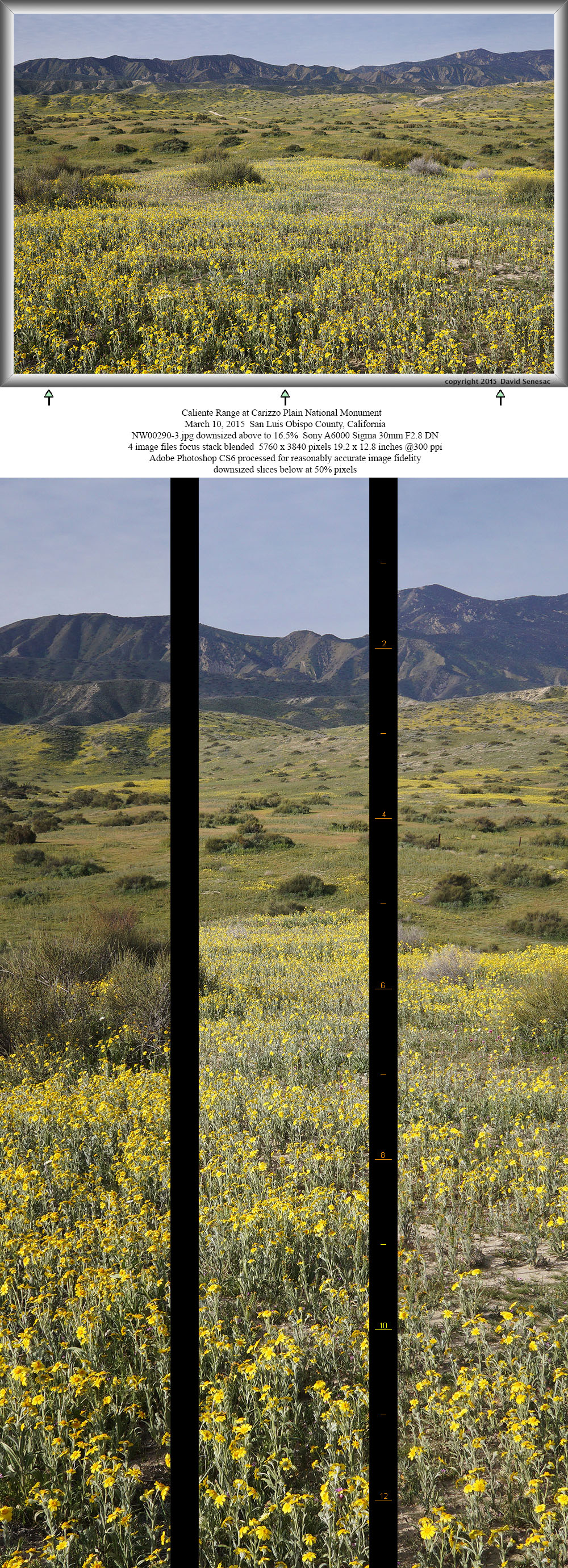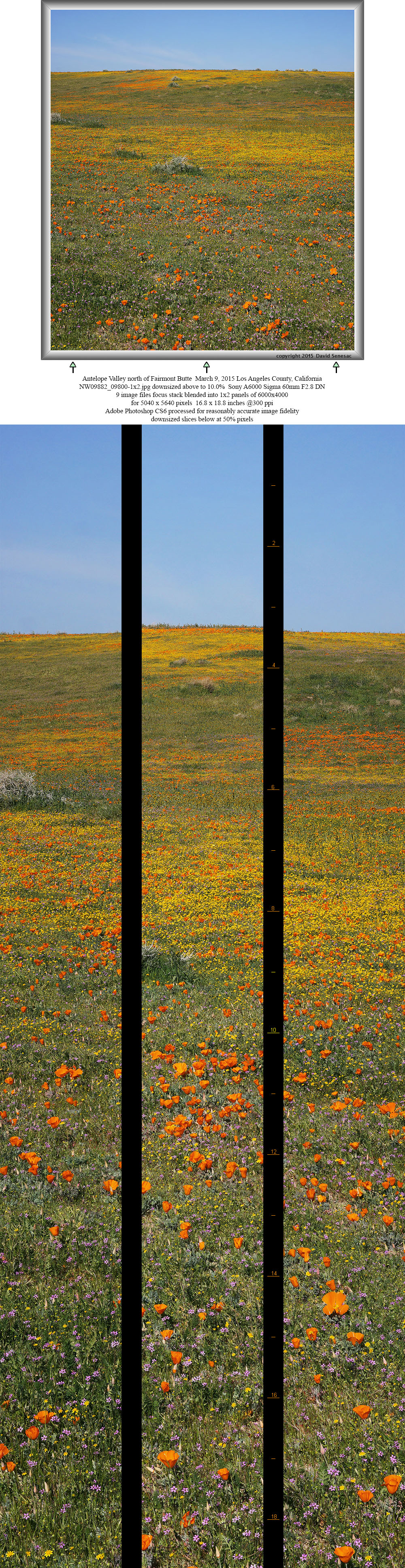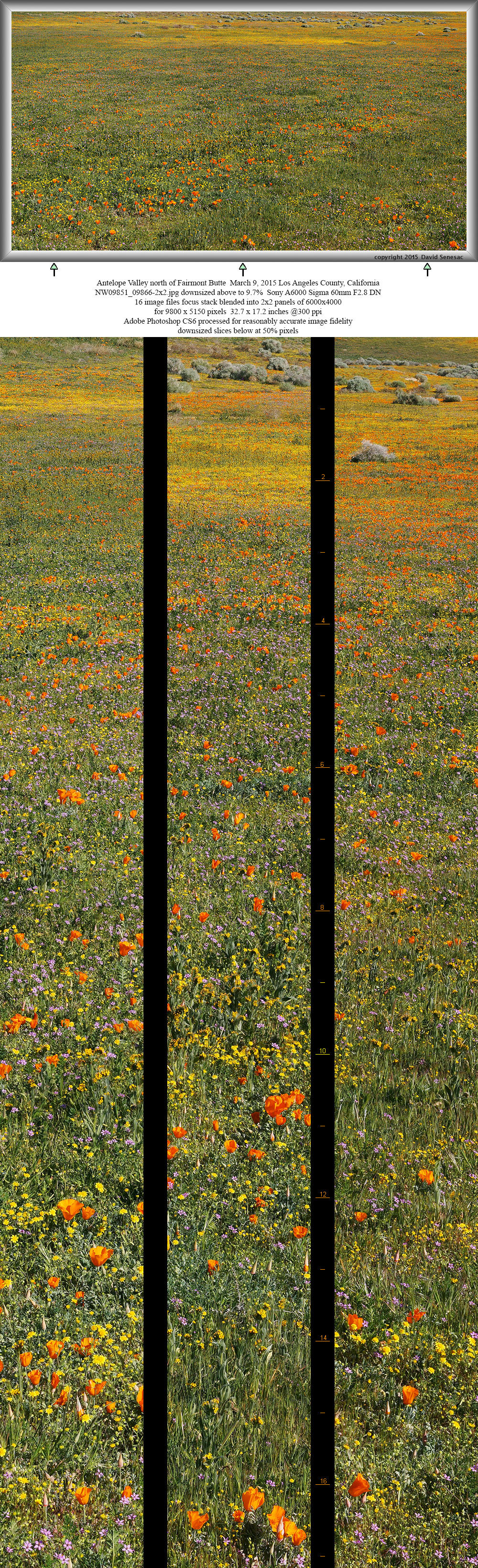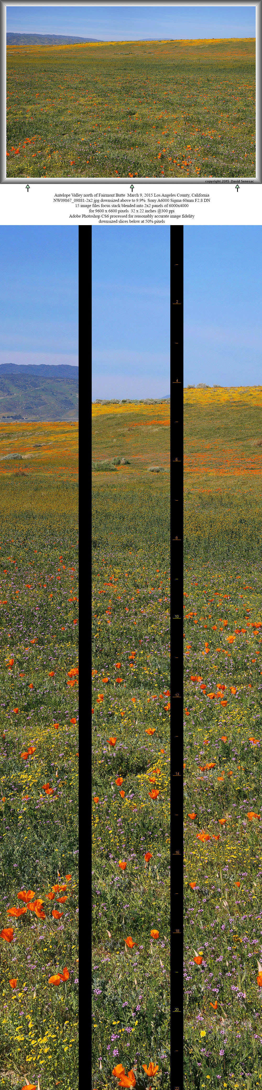 Five minutes later completed another 2x2 panel above from nearby to the southwest. The foreground is similar to the previous image but the middle ground has a dense band of fiddleneck and the background the long length of Broad Canyon with distant mountains and sky at top. In the foreground detail are many poppy and goldfield buds that would likely open in a day or three. Although barely visible in this 9.9% downsized image, in the full image detail middle ground and up the north wash slope, one can see a few white hued desert dandelion. During my visit, many more were still in bud than were blooming and would peak about a week after my visit.