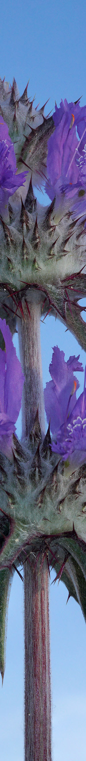 One of the more difficult tasks that requires patience is visually locating best wildflower subjects within dozens, hundreds, or thousands that are about a landscape. Thus look at a great many and only select a very few that not only look good but can be isolated without nearby distracting elements. At the top of my wildflower list was thistle sage, salvia carduacea, one of our state's most beautiful flowers. The strategy with these flowers often on tall stems is to put them up into a background of blue sky then use fill flash. If the sun is out, would also use a diffusion disk. And yeah, spend a lot of time laying low on the ground so this is not a job for anyone afraid of dirt or touching all manner of plants or having a few bugs or ants crawl on one. And note am not a shorts and t-shirt only person but rather almost always wear Levi blue jeans and a thin nylon shell over a t-shirt. Captured 5 images below of the flower for focus stacking about 7:45am.