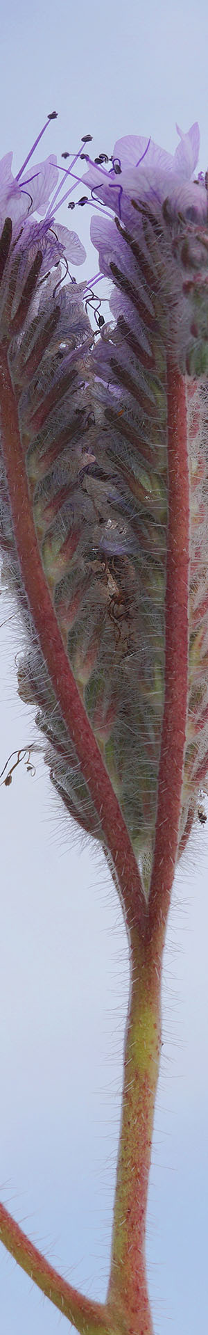 Below picture, lacy phacelia, phacelia tanacetifoli, curling cymes up in a hazy sky.