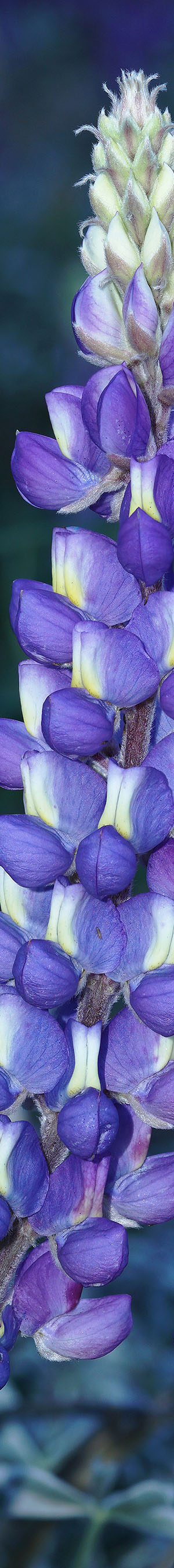 My first subject above was this pair of sweet fragrance grape soda lupine, lupinus excubitus. For any species, one may find many nice looking flowers however most will not work as camera subjects. A good flower subject needs be reasonably capable of being isolated in order to stand out without other distracting elements. And one must be able to position a camera to frame the subject which is often not practical for a list of reasons. For instance if the camera position is close to an adjacent teddy bear cactus or poison oak is below on the ground or the subject is on a steep slope without a reasonable way to tripod and many other reasons. The way the above lupine were isolated was that elements behind were at a far enough distance that they were well out of focus or bokeh. As someone with conservative attitudes towards photographing natural subjects, my own personal rules of the game do not allow manipulating any elements within a frame thus never touch a subject or other elements within view including pushing other flowers out of view that are near or behind. However anything in front of a subject like blades of grass or other flowers I may bend away. With this species one often finds lupine with less aesthetic dried gone to seed flowers at the bottom of peduncles. Here found a good dual stalk subject that I could position my lens so that similar height elements of each remained equidistant from my lens to minimize necessary depth of field. And peduncles were fresh containing only new flowers. Note a few petals showing pollination have changed to purple. Subject was in shadows so used flash that also helps darken the out of focus background because light falls off with distance at a square factor.