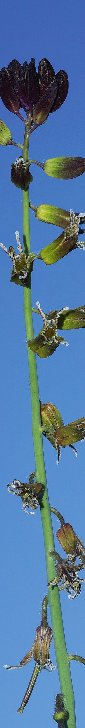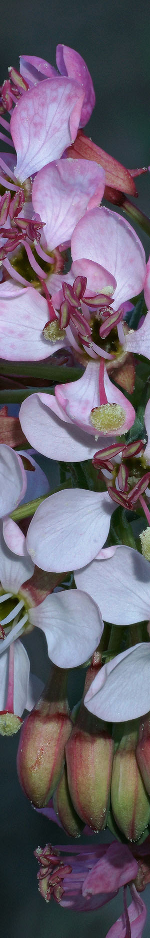Next worked the above Cooper's jewelflower, caulanthus cooperi, that was isolated in a favorite way of placing it against blue sky. Of course finding a situation for putting a flower up against the sky is uncommon and if something possible is found, one ends up awkwardly pointing a camera up from low on the ground where just looking into a viewfinder may be difficult. Additionally any flower stalk that is sticking up high will be unusually tall so is more liable to bob back and forth with even a slightest breeze. This subject was in shadows so used flash. In fact when putting a flower into the sky, being in shadows is an advantage because sunlight on flower close-ups usually produces mediocre images due to harshness. When I do work a sun lit subject, will use my opaque 32 inch diameter silver reflector disk as a sun block with flash in fill mode. By working in shadows, I don't have to deal with also hand holding a disk. And that works into a morning strategy when breezes are more often minimum, of looking for these type of shaded subjects in sun blocked terrain. For focus stack blended sets, an initial shot needs to set exposure lock. Then typically set exposure compensation to -1 1/3 to -2 with fill flash at -1/3 or -2/3 and that may require a test flash to ensure exposure results as intended.