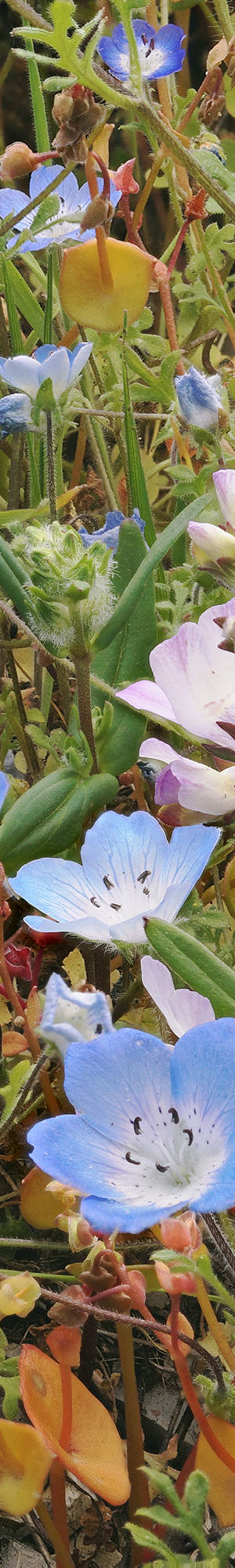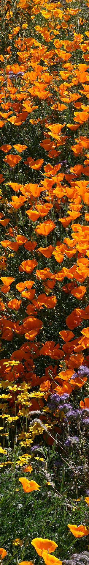 However lower down where the canyon slope met the wide level wash bottom, there, was an area of particularly large robust plants dense with poppies, bigelow coreopsis, coreopsis bigelovii, and tansy phacelia, phacilia cryptanta, that were too tall for any filaree that might be underneath. So took this last token image below that though rather impressive is well down on the list of other similar 4x5 transparency images from past years in my body of work.