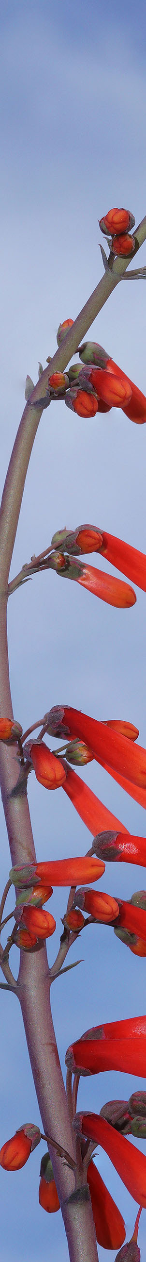 On the way back, a good sized rattlesnake got my attention in an area of small boulders. During the cool of early morning, I didn't have to worry about them but it was now later morning so paid more attention to where I stepped. Returned to the car and contemplated on how I had managed to put much of the morning while breezes were still calm to poor use. Per weather forecast it was likely to be breezier Saturday morning. Drove off to the nearby Desert Pines Wildlife Sanctuary by the California Aqueduct in order to find a specimen of scarlet bugler, penstemon centranthifolius, that were in the flats. After a long time looking at dozens of plants walking around in circles finally got down to business putting this nicely curving specimen below up in the sky. And that took about an hour because the intermittent breeze was becoming continuous. But after setting up the image knew this was a very good subject so I stuck with it. Used a diffusion disk with fill flash.