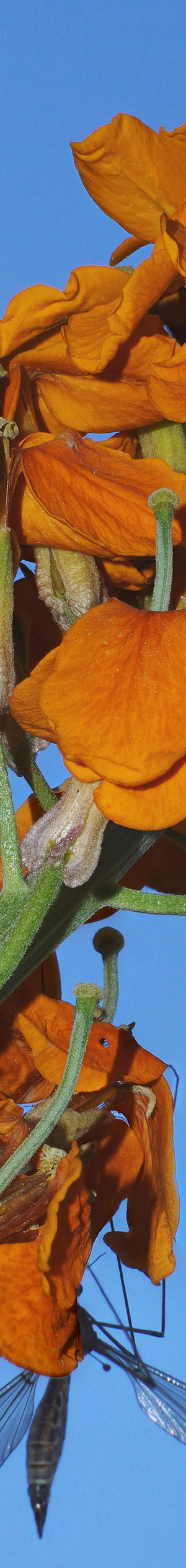 The next species above against blue sky is very widespread over western North America, western wallflower, erysimum capitatum, that is yet another uncommonly orange wildflower though a muddy orange, with flappy petals. And yes I will be showing a poppy a bit down the page haha. This flower shows a giant crane fly enjoying its nectar breakfast. This specimen was already in shadows so used flash as well as a lens extension tube. If it had been in the sun, would have had to block the sun with my opaque silver reflector because direct sun on flower close-ups is usually too harsh. That can complicate taking a shot because not only am I laying down on the ground to look through the electronic viewfinder while holding a remote infrared shutter release in one hand, but also must somehow hold up the reflector or diffuser with the other. And do so repeatedly through several shots while manually moving the focus point between each shot by either adjusting the Auto-focus position with the camera's multi-button or adjusting the lens barrel if in Manual Focus mode. During such, bumping the camera or tripod causing movement will ruin the whole series. So the process is a rather involved and delicate.