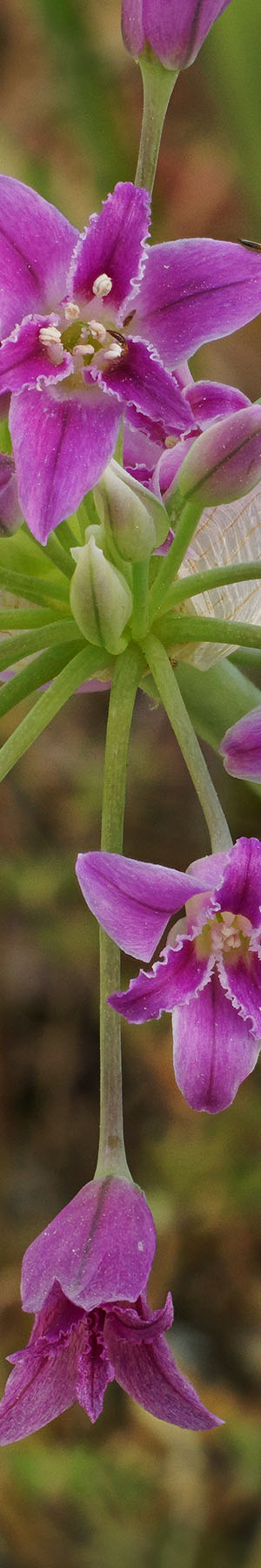 Driving along the wide recently bulldozed dusty dirt road, noticed these onions growing up on a slope across a very old deteriorating barbed wire fence. Cattle had obviously not visited the area in months and there were not any NO TRESPASSING or PRIVATE PROPERTY signs anywhere for a mile so I had a legal right to wander on the other side as long as someone didn't come along asking me to leave. Such is often the situation in remote rural areas where people rarely have visitors thus don't worry about keeping the rare person or local neighbors or kids off their lands. Took quite some time choosing this subject above of, crinkled onion, allium crispum, and once I set this up in my viewfinder knew it was a rather special beauty. Although the A6000 has a large tiltable LCD, I almost always turn that off and instead use the electronic viewfinder that doesn't have usual sunny ambient light issues. The viewfinder also requires less battery power. This specimen of is also an example of the careful effort I take isolating individual flowers elements against a background working the flexible Trekker tripod slightly up down right left even when having to lie prone on the ground on my right side, looking into the eyepiece semi-sideways.