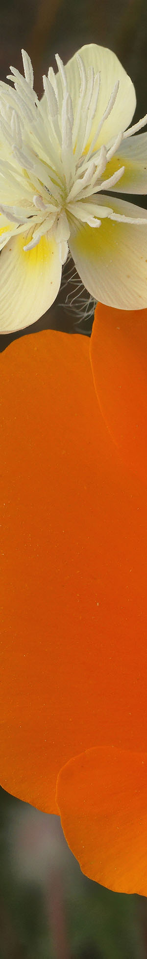 So here is the California poppy, eschscholtzia californica, with a creamcups, platystemon californicus, mentioned above. Orange simply does not get any more perfect. Notice how the whole poppy bowl is a deep gorgeous orange. Now compare that to the inferior orange of the two other species above and that leaves little wonder why early European explorers spoke so highly of these flowers. Further north and about many areas of the state, the outside petal poppy bowls are a less saturated yellowish-orange while only the center inner petals have the deeper orange color. Notice the tiny pile of pollen below the poppy anthers. Used lens extension tube with diffusion disk.