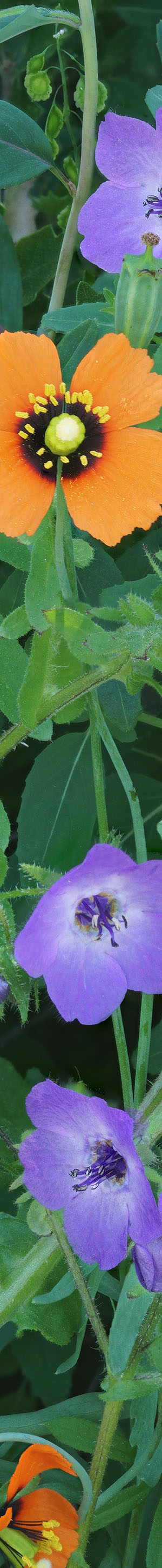 After working some other subjects, drove back down to highway SR138 and continued east into Antelope Valley surveying areas to the south where north facing Portal Ridge still had areas green with vegetation and some large expanses of poppies. The areas I would focus on were at Desert Pines Wildlife Sanctuary and nearby Portola Ridge Wildlife Area that are a few miles west along Lancaster Road on the south side of the California Aqueduct. Mid morning at the latter, crawled under a barbed wire fence where a wash came through then hiked a half mile up the canyon until trees choked further progress. The area was full of wildflowers, more species than one finds in the valley areas below which is generally the case on Portal Ridge, a 30 mile long west-northwest to east-southeast trending ridge south of the west end of Antelope Valley. On the south side of the ridge lies the trench of the San Andreas Fault. However flowers had the same droughty dry often stunted look of plants on my trip two weeks earlier. Filaree and fiddleneck in the area though still showing flowers had already gone to seed turning stems and leaves an unaesthetic yellow-green and brown.