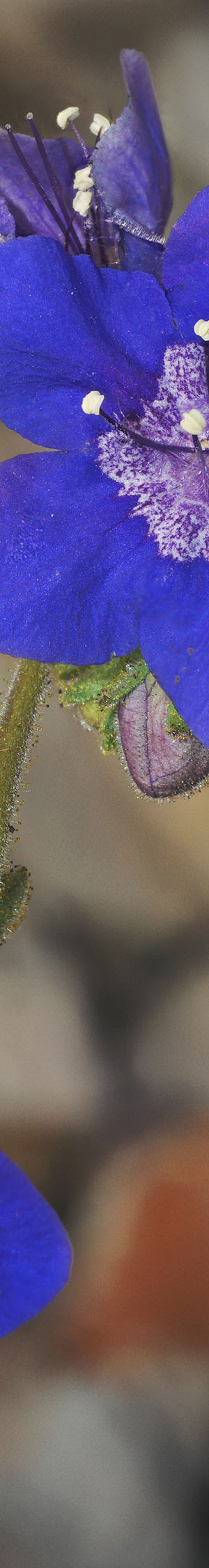 Midday with a breeze picking up, drove out to Jolon Road and then into Fort Hunter Liggett. Along the way were a couple of roadside vernal pool areas with beautiful downingia but none of the images were successful primarily because I didn't take enough focus stack shots for enough depth of field because of the breeze. Into the military lands, wildflowers were noticeably less impressive than during other visits. I drove west out to The Indians in the San Antonio River headwaters working a few flowers but conditions were rather dry. Then late in the afternoon I continued north on US101 and out back west along Arroyo Seco. Just beyond the junction of Carmel River Road is a patch of an uncommon plant tacky phacelia, phacelia viscida with deeply saturated blue flowers. Made the above image using lens extension tubes and diffusion disk. This interesting species is related to canterbury bells one finds in arid Southern California areas. The dot patterns down in the flower throat are unique to this species.