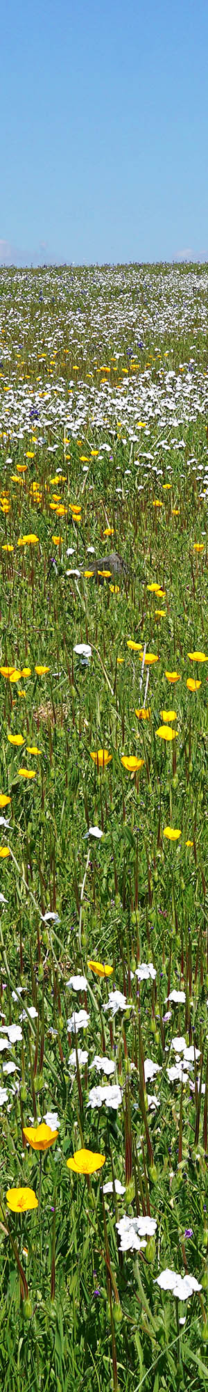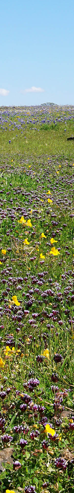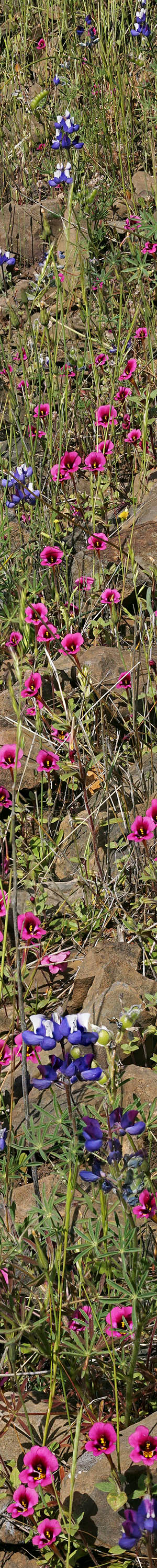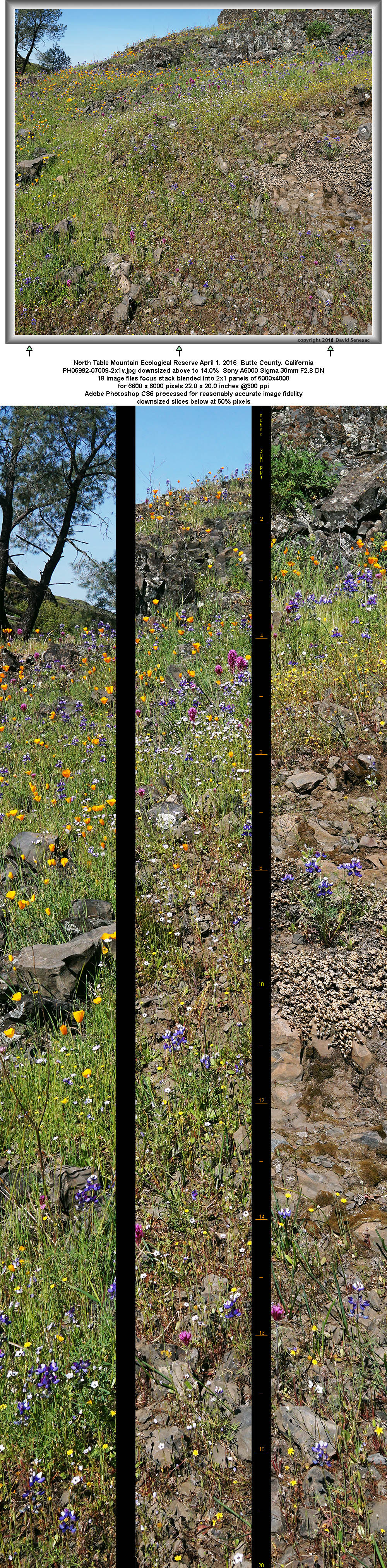I saw lots of strong subjects all about but the breeze had simply became too difficult for blending sets of images. Had I been carrying the Wisner 4x5, I would have been much more active because there were lulls in the breezes but too few if one is taking multiple shots per image. By this time I'd convinced myself to give Saturday a shot instead of driving home. So no need to stick around to the end thus endured one last subject above at 4pm. Put on the 60mm for a close-up mug shot of a steep dense patch of flowers with much filaree, green beaks pointing up, and deep blue sky. At the skyline in the center slice of the enlarged vertical slice view are a group of grass pink, petrorhagia dubia.