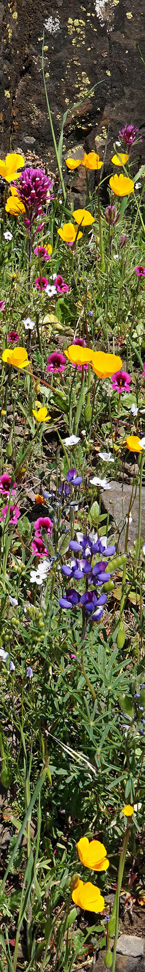 After a couple oblique subjects with sky, shot another above at 1pm PDT with the sun at it highest altitude that captured another riotous mix of strong color. With flowers much like fall leaves, the saturation of subjects hour to hour is very dependent on the direction one is pointing a lens. Thus I am always first assessing where color looks strongest and then finding frames from that direction. If color looks flat on an otherwise strong subject, I will consider what time of day that might change for a later return. As I'm standing on these slopes this Friday am shaking my head while being aware I'm standing out looking at what are arguably the strongest wildflower landscapes in California during this 2016 El Nino year at absolute peak and there are virtually zero...nada other photographers about. A few groups of people by late morning did pass through this section on their way to waterfalls and most probably snapped some selfies and group pics with their cell phones but that was about it.