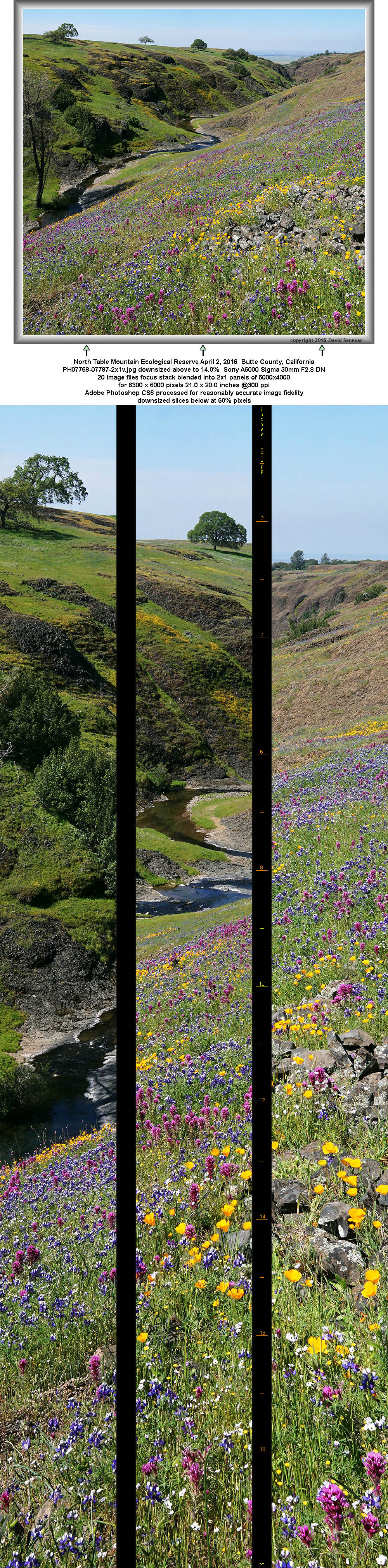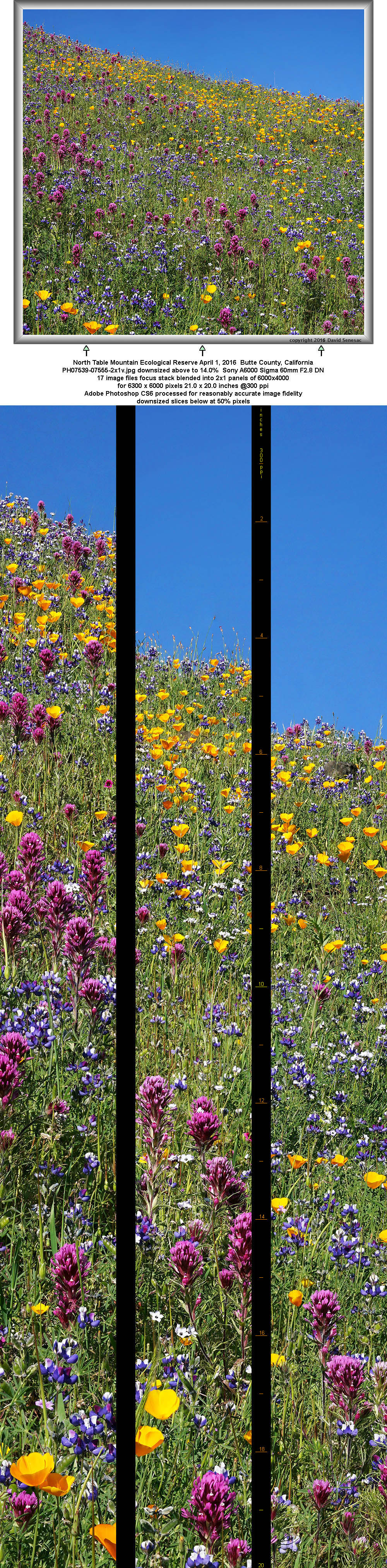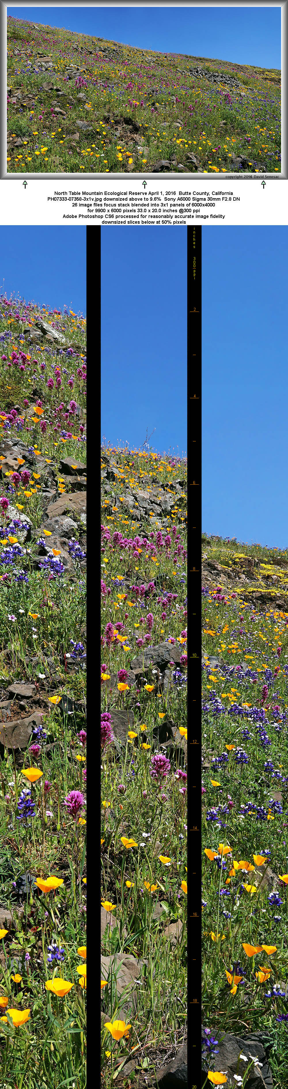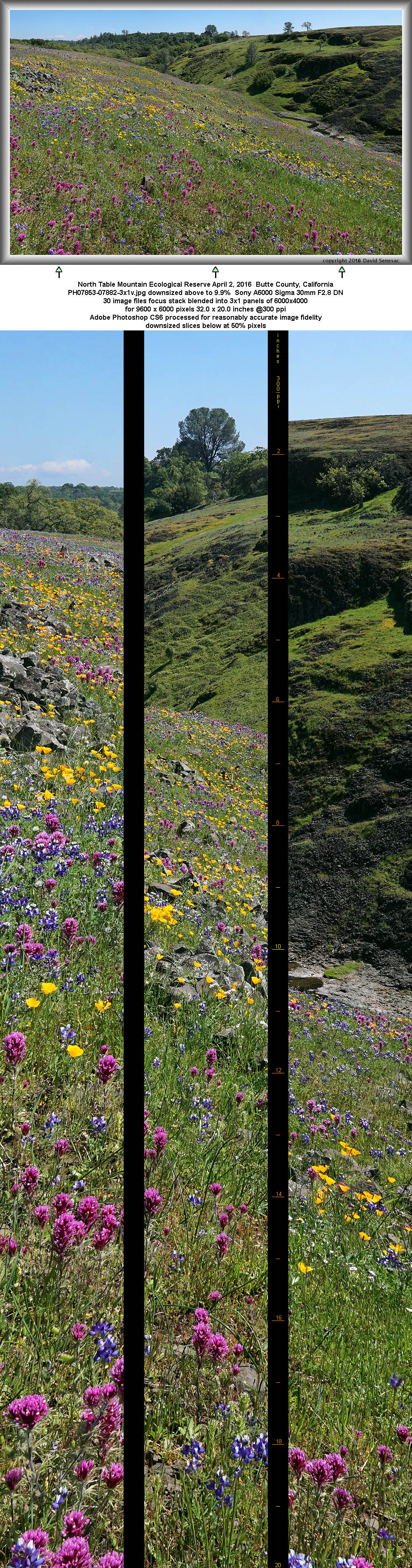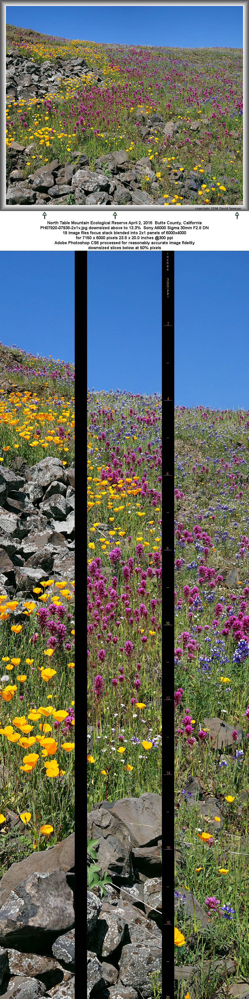 It was then 2:15pm and indeed the breeze had waned some so I returned to the image at page top. Although I wanted to use my 60mm on the landscape for a 6 column 2 row panoramic, I thought it wise given the breeze to first just use my 30mm that only required a 3 column single row 3 frame capture. It takes four 60mm lens frames to cover the same area as the 30mm because it is a square factor. And indeed captured the wonderful image at page top, PH07883-07910-3x1v North Table Mountain riot of wildflowers, without having to wait long. Then put on the 60mm lens and waited 20 minutes but now the breeze only became more difficult and since the subject was right at the brink of the canyon, a breezy location, abandoned that effort. Another subject that would have been ideally captured with my 4x5 view camera and required just a single momentary lull to do so.