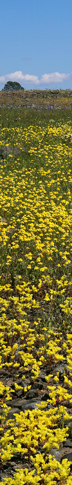 And again on a hard basalt substrate dwarf stonecrop, parvisedum pumilum, California goldfields, lasthenia californica, and on the rise sky lupine with oaks in the background distance. And note fresh goldfields have a wonderful fragrance, another reason to get low haha.