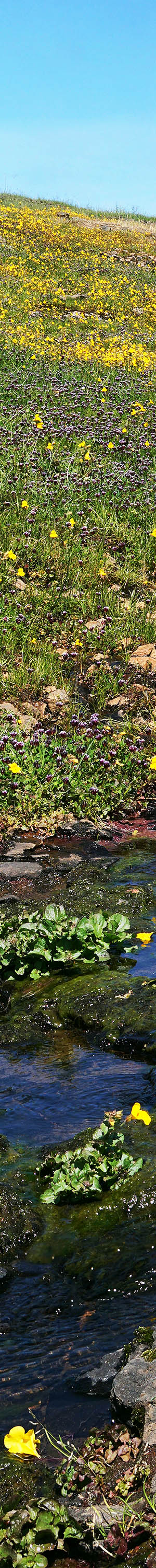 The meadow areas for landscape photographers have lost much of their aesthetic appeal because the Rim Fire burned through all the surrounding forest leaving ugly blackness, stumps, and scattered partially burned trees that have managed to continue living. However the rich nutrients released by the fire have been a boon to all areas I visited on the trip so a productive area for intimate landscapes and close-ups. Dense areas of sky lupine, meadowfoam, and woolly sunflower covered significant areas. Beneath forest one see lots of big iris. Water tends to pool in some meadow areas early season that creates areas that downingia thrive on and so it was where I shot the above image. Unfortunately by the afternoon breezes had increased enough even in the dense forest about these meadows that I could hardly work any species with confidence usable results were possible. The above micro green jungle with Sierra downingia, downingia montana, and pansy monkeyflower, mimulus angustatus, are two small wildflowers but beautiful when magnified by a digital close-up.