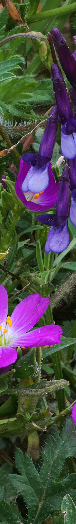 The following weekend Saturday morning May 8, drove up to nearby very popular Russian Ridge Open Space Preserve along the crest of the Santa Cruz Mountains. The day was nicely overcast with diffuse light from cloud banks pushing up against the coast but that also brought breezes flowing over the ridgeline like water spilling over a dam that was unproductive to work with. Nice numbers of wildflowers and species were about the reserve that was now at spring peak. It was much better than the previous 4 droughty years but much less impressive than in 2005. Regardless had a nice 4 mile hike workout. Along the way captured these pretty red maids, calandrinia ciliata, above with purple vetch, vicia villosa, an alien European cattle forage species widespread about Northern California grasslands. As a young kid, vetch often grew in fields of our Orangevale neighborhood where we would create tunnels through its dense tangled thigh high growth. In the above I was surprised how aesthetic its flowers look in close-up detail.