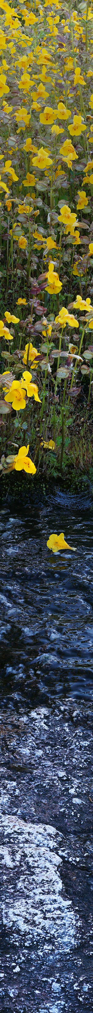 Saturday morning May 28, 2016, rose at dawn and was soon rolling slowly along the quiet road looking for wildflower subjects and they were all about. On sunny days, early morning is often calmest and before sun is high enough to shine on subjects one can use the unsaturated early blue skylight as a diffuse lighting source. I climbed up from the road where I noticed a dense patch of seep-spring monkeyflower, mimulus guttatus, above the road, a bright yellow subject that would greatly benefit from diffuse skylight versus harsh sunlight. The flowers grew atop complex bio-mat communities of primarily moss that were atop glacially smoothed sloping granite bedrock where water on slopes above drained down along the impervious bedrock boundary. Between the moss mats were bare rock areas blackish green with slippery slimy algae. Here and there contrasting yellow petals had fallen onto edges of the dark bare rock. The heavily dewy monkeyflower had obviously been blooming for several weeks because there were many stems already gone to seed. See the dewy spider webs just in front of the dark slab? The water source would soon shut off and its greenery would quickly dry out, brown up, and go dormant. Wildflower work on this trip used my Sony A6000 atop the super gymnastic Benbo Trekker tripod instead of my standard landscape Induro tripod setup that uses a manual panoramic head with the camera oriented vertically. With the Trekker most of my stitch images below are just 2 shot stitches with horizontal camera orientations, single column 2 row.