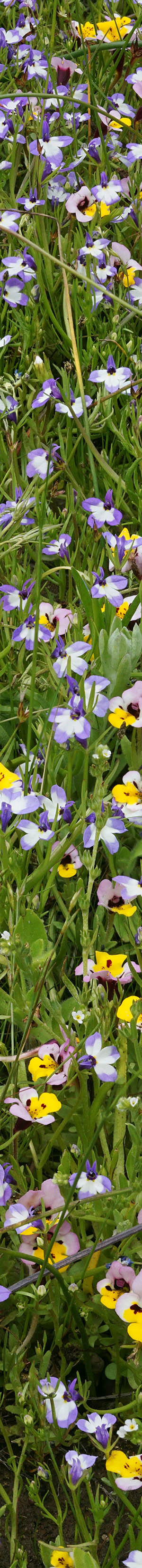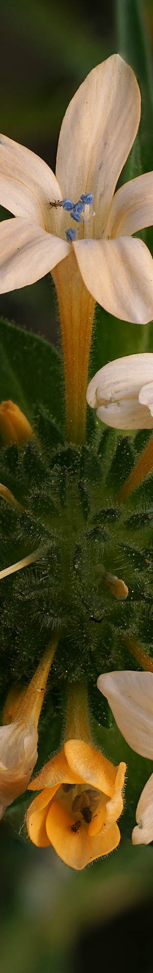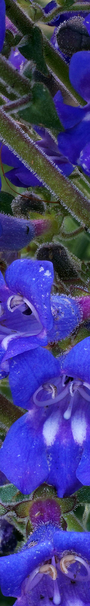 One of the more abundant species blooming in dense patches was azure penstemon, penstemon azureus, per image above. The saturation and blue hue varies considerably between plants even in the same patch. I hunted for a most saturated blue subject dense with flowers. Notice how color of the lower outside flower tubes changes to purple then white with a bit of yellow? Do you see the white female stigma? Easier to see in the magnified enlarged vertical slice view. Also notice the curving male stamens with light blue filaments that end with pastel anthers containing attached odd white brushes.