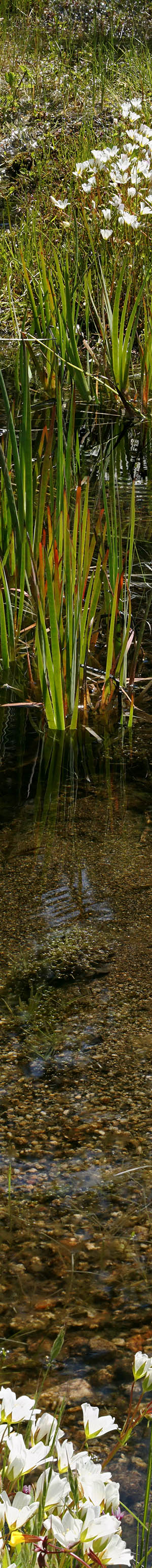 I drove east past the city of San Fransico's Camp Mather that has been shut down undergoing repairs since the Rim Fire. In the past before the Rim Fire, the Strawberry Bluegrass Festival was held each Memorial Day weekend. At the junction I continued beyond a gate that opens at 7am each morning onto Hetch Hetchy Road. A mile further one enters Yosemite National Park coming to the entrance station where vehicle license plates are logged and windshield placards handed out per security policy about San Francisco's water supply. Almost all cars were headed down several miles to the dam parking lot but I would only be driving 3/4 mile to wander about the granite flats of one of my favorite late May areas below Poopenaut Point. Over decades visiting at this time of year, I have never seen another person stop there. Unfortunately found conditions drier than normal and the expected bloom of clarkia williamsonii had not yet appeared. I did stop to work a small stream pool area surrounded by water loving dense white meadowfoam, limnanthes alba. Mixed in with the white with pinkish tints meadowfoam were scattered white-tipped clover, trifolium variegatum, and dainty yellow hued opposite leaved tarweed, hemizonella minima. Within the pool of clean clear water were surface moving water striders.