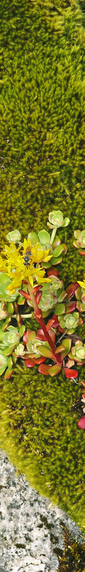 Back at my Subaru, the inside of the car had been baking in the sun so immediately opened all the windows while driving further down the road into the canyon. Where one first gets views down into the canyon at 5000 feet there are old granite road cuts on the uphill side of the road blasted by dynamite nearly a century ago that have been colonized by one of my favorite species, Pacific sedum, sedum spathulifolium, atop mats of moss where spring seeps drain down from higher slopes. The small star-like clusters of flowers are only part of the aesthetic wonder of the species. Like other glaucus sedum species, it specializes growing out of bedrock cracks on steep faces or atop moss covering such rock faces. The spatula-like leaves arranged in rosettes have a range of light green to greenish yellow to cyan, aqua, and red hues. The stems are usually red but can blend into yellow, greens, and even orange. Each spring this area offers a different surprise. On this trip I found an interesting subject above that included a section of lichen covered granite. Frame upper left is a small brittle fern, cystopteris fragilis, one often finds growing about shady spots on steep bedrock. Subjects like this tend to be considerable more interesting when looking at the full image. Select the enlarged vertical slice view to see a bee enjoying the top of the flower. To improve what was an uneven shaded illumination, I used my 32 inch silver Litedisk collapsible reflector reflecting light off sunlight that was close to shining on the subject.