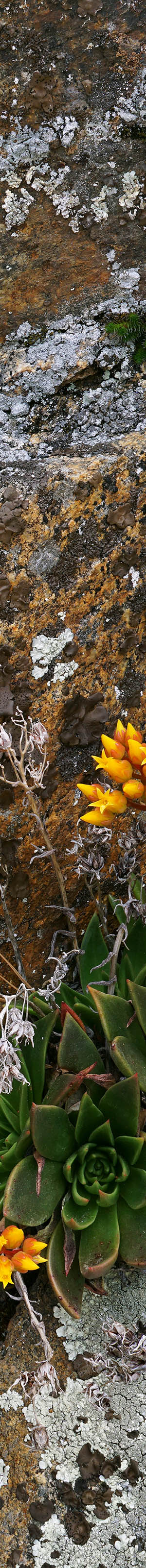 Driving back west past Poopenaut Point where the road swings south, it passes by a superb area of canyon dudleya aka live-forever, dudleya cymosa, on the old granite dynamited road cuts. This relative of the above Pacific sedum also enjoys cliffs and rock cracks though prefers drier substrates and tends to create some of the most picturesque settings of any California plants. I really liked the above subject because besides the textures of lichen and moss in cracks, there were pyroxene mineral surfaces on the granite adding nice rusty orange color.