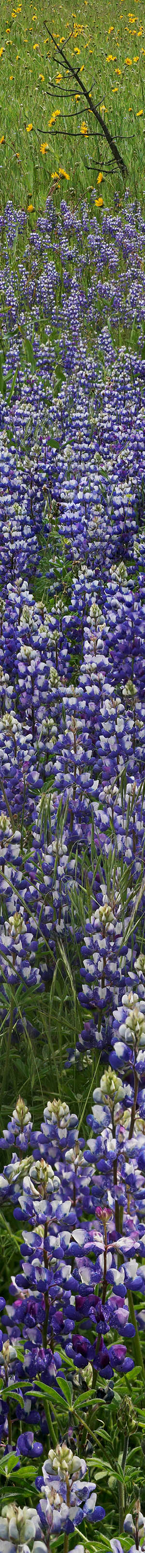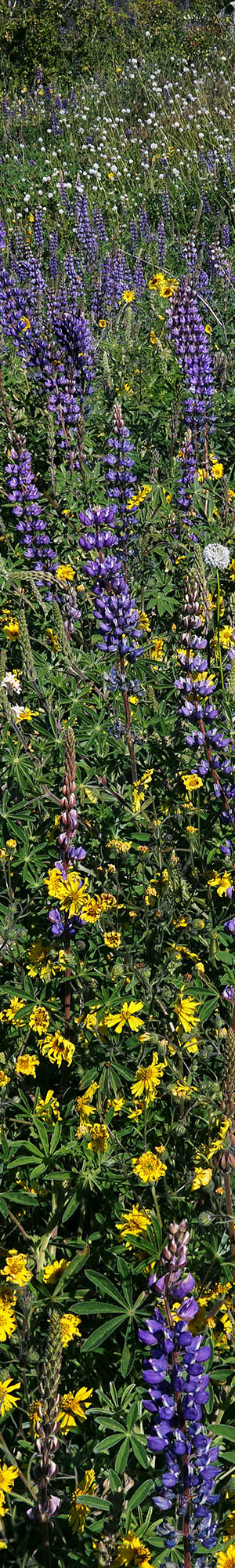 There were a few dense patches of sky lupine, lupinus nanus, and in the above modest shot included woolly sunflower, eriophyllum lanatum, in the background. However part of the scene was shaded by pines while the background was in the sun thus impossibly contrasty. So I waited nearly an hour until a cloud finally passed over the frame while breezes were also relatively calm, providing even lighting.