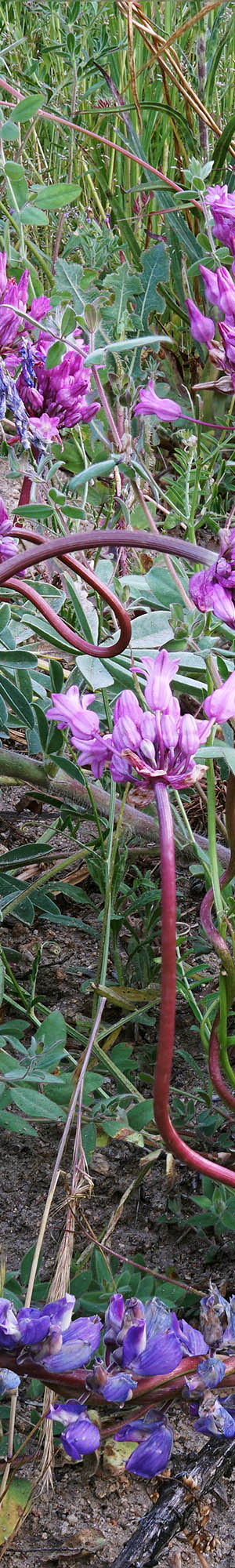 Sunday morning May 29 awoke again at dawn to many friendly tweeting birds, rose up, took care of gear re-arrangements, then visited a couple nearby subjects still in shade, I had sized up Saturday. I was surprised as a rousted black bear apparently startled by my vehicle, ran across the terrain above the road and into the Granite Creek ravine. First above was one of the best snake lily subjects I've ever come across. Twining snake lily, dichelostemma volublie, has a fascinating vine-like strategy of twisting around other plants and bushes with greater natural stem robustness, in order to stick out up above and beyond into sunny openness. In doing so the result is often quite a sight. Unlike strangling plants, the snake lily doesn't choke its host though the result on smaller plants is often stem confinement. Here three of these snakes have twisted around a single large broadleaf lupine, lupinus latifolius, peduncle and elsewhere other snakes seem to be grabbing other stems of this large lupine plant that obviously is still in an early stage of its growth with several peduncles rising up showing just buds. This zone of the Tuolumne seems to have an abundance of snake lilies, many times more than I've encountered anywhere else. And broadleaf lupine dominate roadside areas along the road for a couple miles.