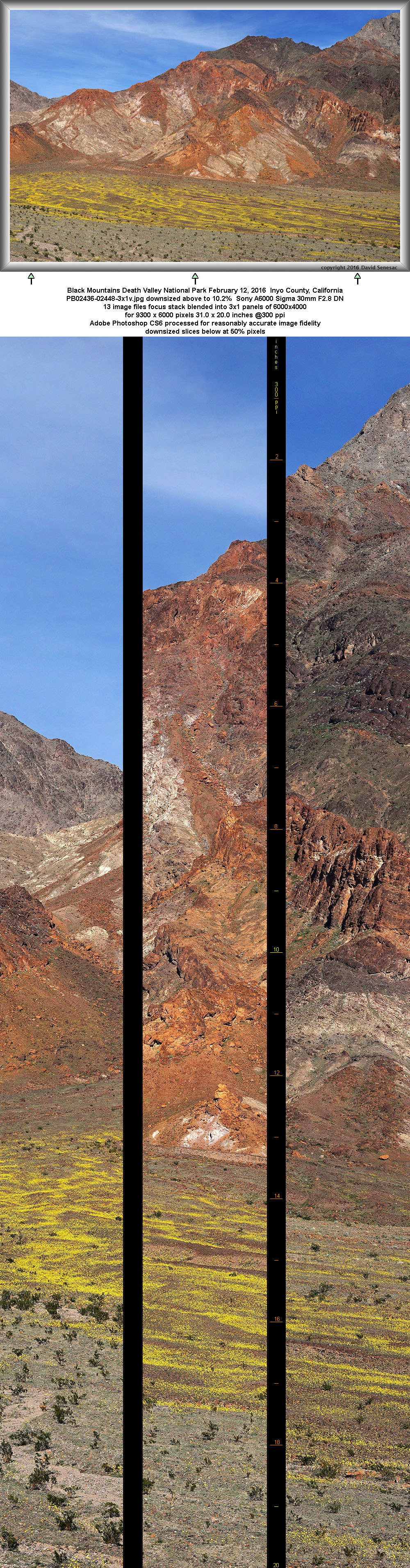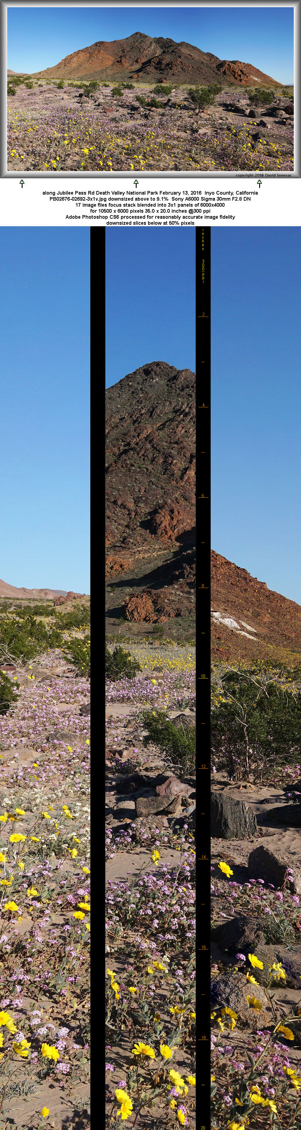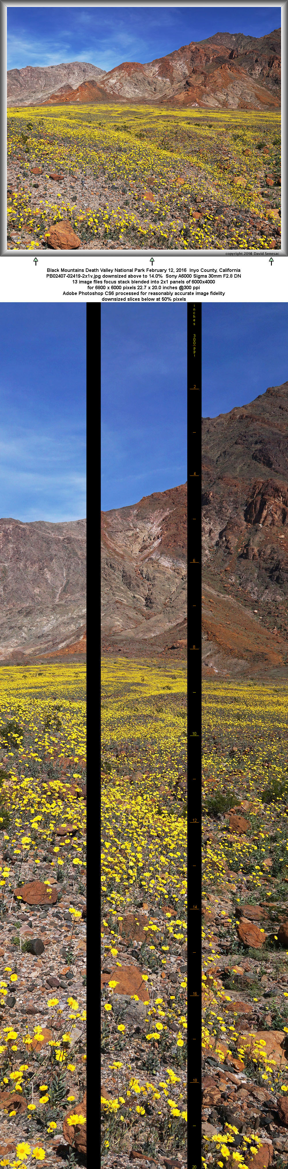 Between Furnace Creek and the south end of Artist Drive it appeared little rains had fallen as there was little green. From that point south desertgold and brown-eyed evening primrose increasingly appeared. It was at the Copper Canyon bajada that I came upon the first dense flower fields, just as was the case in 2005. However photographic light was still much too shadowed. The area would be best at mid morning so I entertained expectations of stopping during the morning of my return leg a few days later. Since what had been a slight breeze came to a complete null, I did stop at the alkali salt pond a mile south of Mormon Point for the below modest reflection of the southern section of the Panamint Range. With my Sony A6000 24mp mirrorless body with Sigma 60mm F2.9 DN lens atop a Nodal Ninja III MKII panoramic head atop an Induro CT113 carbon fiber tripod with a Manfrotto MH054M0 magnesium ballhead, captured 4 columns by 1 row frames in camera landscape orientation for stitching. That created a long narrow image file of 18900 x 4000 pixels. By selecting the enlarged 33% horizontal slice view, the yellow flower areas are much more evident. The white band just above the pond edge is the Amargosa River bed that in wet years may be part of Lake Manly. There was still lingering snow at highest Panamint elevations from the cold January 31 storm. Lake Manly unlike in 2005 when the water covered extensive areas of lower Badwater Basin, was now just white alkali salt flat expanses with a few areas of shallow surface water.