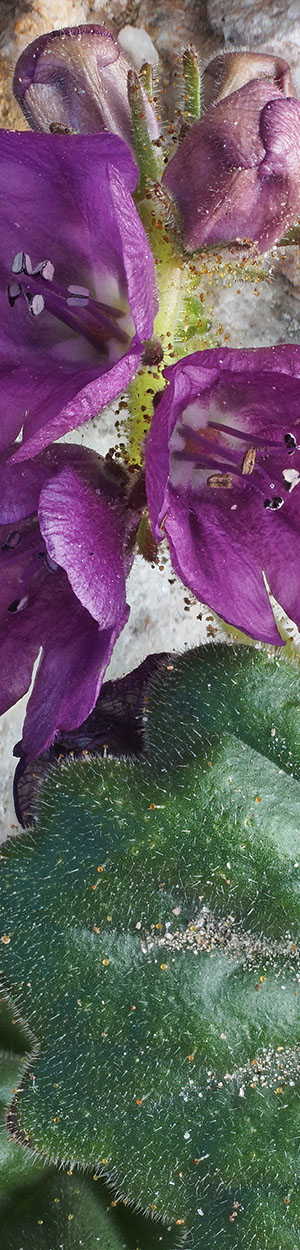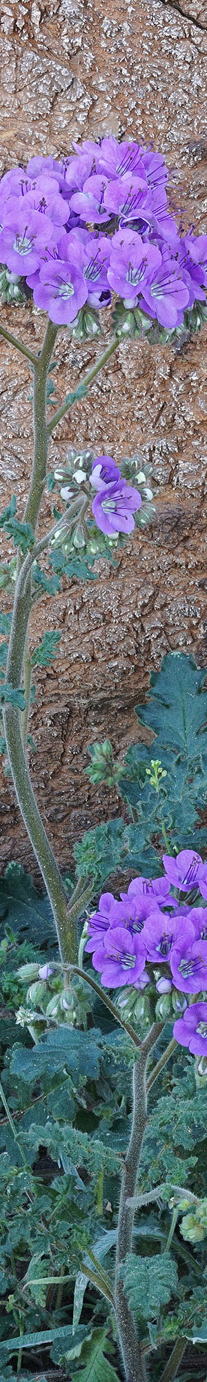 Eventually I decided to try some close-up work on plants about a somewhat protected aspect of the peaklet that had lots of notch-leaf phacelia, phacelia crenulata. Using my collapsible diffuser and reflectors managed to endure pesky breezes enough to make 9 captures of the above subject for focus stack blending. The issue with such work is that when one blends several images, if any elements are not in registration, the result may show multiple edges. When a slight breeze moves vegetation like this, although it may appear plant stems and flowers bounce back to where they had been, at the high resolution magnified levels of current high end digital cameras that is not perfectly so. Before long I tired of waiting out momentary calm so as the sun rose up enough to provide better light for landscapes, abandoned that work, went back to the Forester, switched the camera from Benbo to Induro tripods, filled up my daypack, and set out on a long exploratory hike I'd decided on the evening before.