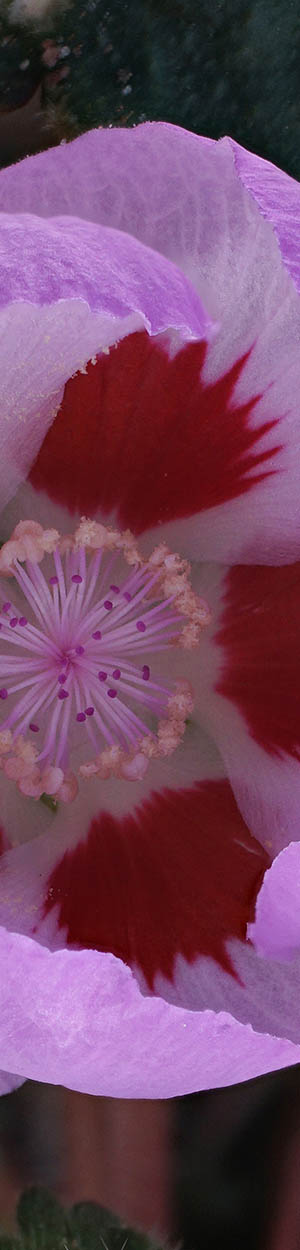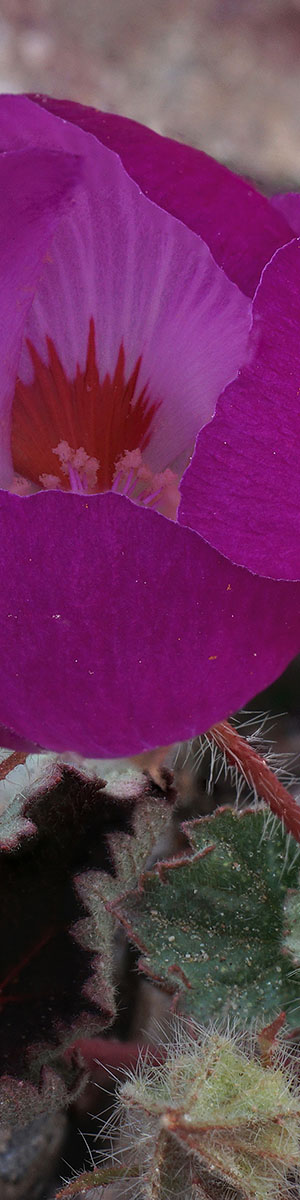 Along my route stopped at prospective late afternoon photo spots where flowers were most dense to possibly return to. Explored up a ravine I'd worked in 2005 then up and over multiple ravines and ribs. Hiking cross country on Death Valley bajadas and washes is rather tedious because the cement-like surfaces are irregularly embedded with variable small-sized rocks. At one remote location some unusual color caught my eye and was looking at a novel deeply rose-magenta hue variant of desert five spot, eremalche rotundifolia. Searching around that same zone showed another couple of those variants among far more normal pink flowered plants. Thus the color trait was a seed strain and not a single mutation. Though in a rather awkward location for a photo, I managed the above 8 image stack set which was enough to bring the full bowl into sharp focus plus a few near buds and one very well imaged leaf while the background remained oof. Should we name this variation a Royal Desert Five Spot?