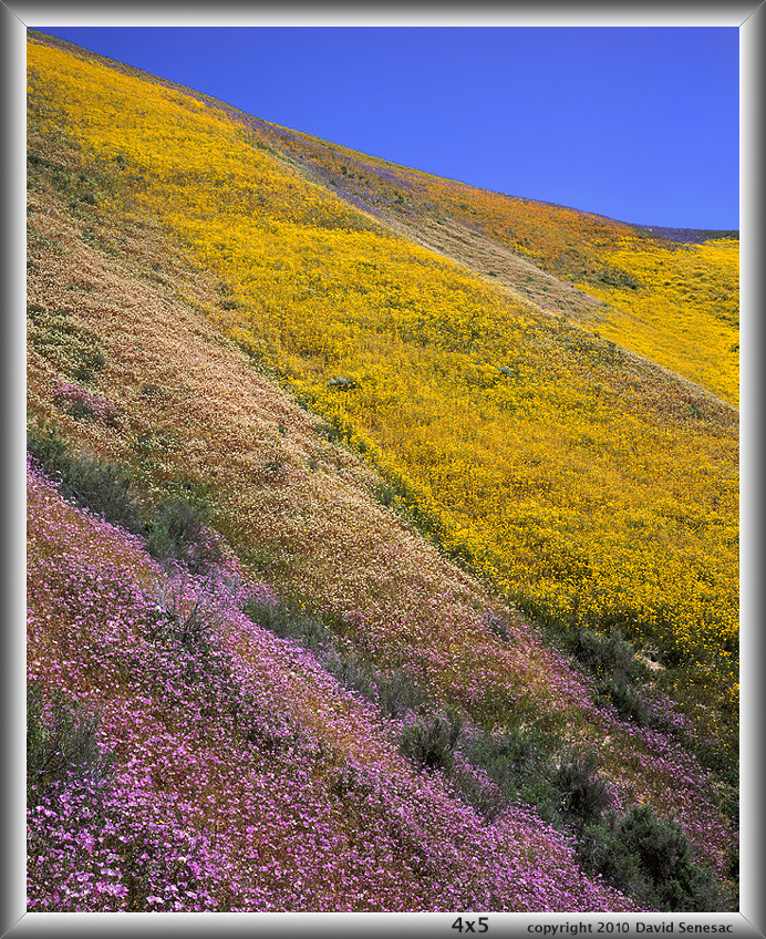 Enough rain that the paved road had to be closed due to flood debris! That was enough for me to trigger a trip that I announced on the Yahoo calphoto groups web site. My expectation was that plants would need at least a week to absorb the new water and then put it into new green growth and buds into flowers or for new plants to emerge and increase the overall greenery. Upon evaluating weatherunderground.com 10 day wind forecasts set dates at short notice beginning Thursday afternoon February 11 with a return on Tuesday February 16, a 5 day trip. Monday was the Washington's Birthday holiday. It was absolutely key that forecasts were for at least some periods of light winds because such is absolutely necessary for making large landscape images with high resolution foregrounds. Some others were making plans for March however most of the annual plant seeds from the 2005 super bloom had already risen much earlier than in 2005 and plant cycles of the blooming showy species would not wait that long so I expected the peak bloom would happen as soon as the recent storm's water was absorbed.