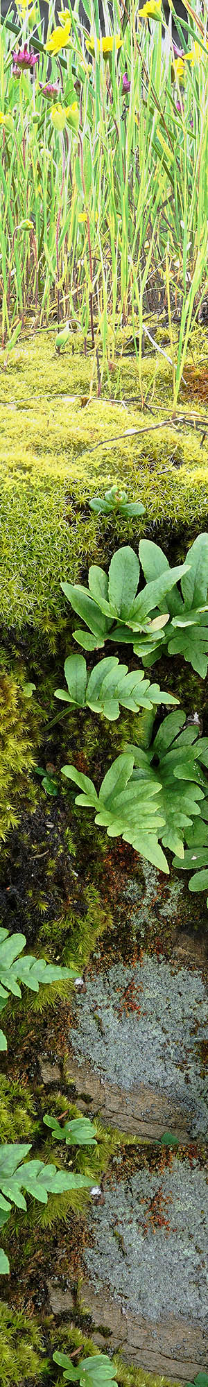 This next image below shows the side of a moss and lichen covered boulder with a fern and on top a jungle of goldfields, lasthenia californica, with a few purple hued tomcat clover, trifolium willdenovii. Goldfields have obviously just exploded, rising in the area as they are bright yellow and fragrant and with rains this week, more will continue to emerge within a few days.