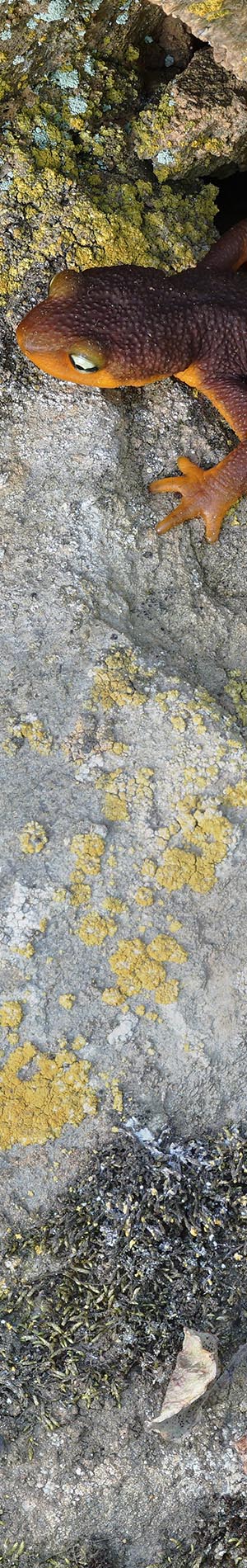 On the side of the ranch road I noticed a California newt, taricha torosa, in below image. These slowly moving orange brown hued amphibians are common in the area, a sign the region receives ample rains. I often see them along the seasonal stream beds or at the shady damp bases of coast live oak and buckeye trees where they likely spend hibernation periods. The small green plants are delicious miner's lettuce, claytonia perfoliata, that are abundant in the park, especially below tree canopies and northern exposures. Lichens and mosses cover the chalky Pliestocene Era marine sandstones of the area providing interesting colorful detail in close-ups. The enlarged vertical slice view shows the soft vulnerable creatures cartoon like head.