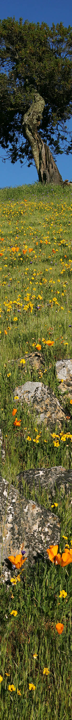 Conditions were even better than I expected but I could see the California poppies were already starting to close up so quickly went to work knocking of the image above at 4:45pm. There was a light breeze I had to wait for lulls before actuating my infrared shutter release. There were nice areas with johnn-jump-ups, goldfields, blue dicks, and holly-hocks about the northern and western exposures of a hill within a matrix of beautiful lush green grasses and herbs. I worked two other nice subjects before finding this next subject above that was the most lush with coast live oaks, quercus agrifolia, at the hill top.