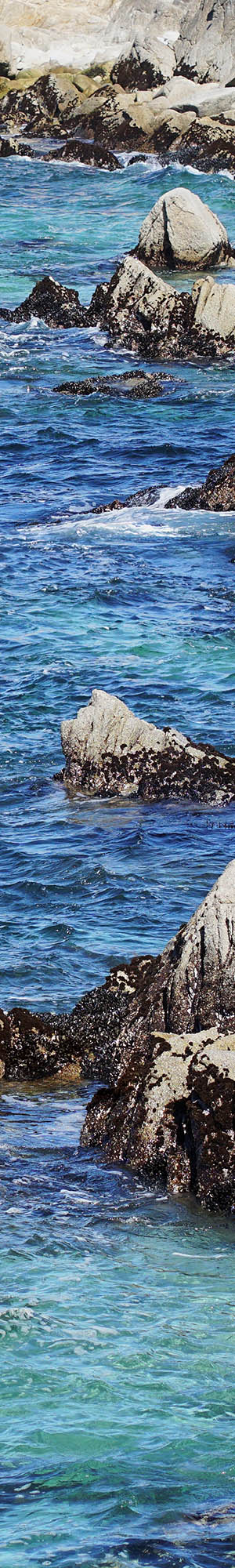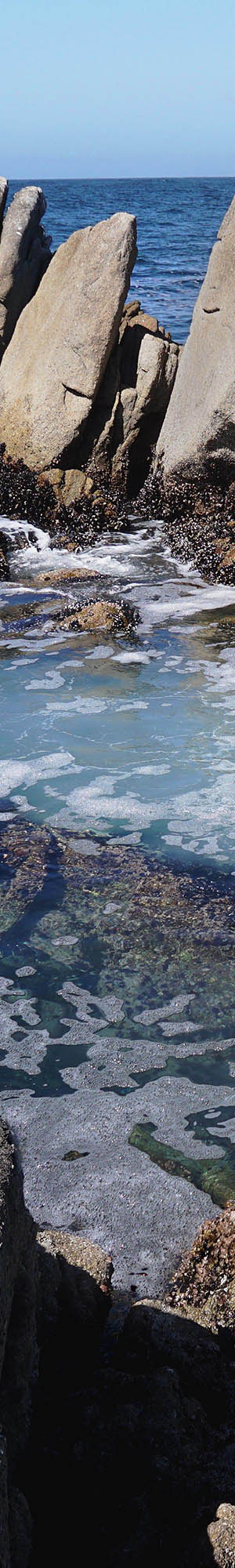 The first subject I worked was at 3pm while the above wide angle 19mm lens landscape with pinnacles out on Lover's Point at Hays Perkins Park was shot at 4:15pm PDT. When tidal levels are high enough, large waves focus their explosive crashing energy within the confines of this channel that provides an exciting location to sit back and watch. Dark black California mussels, mytilus californianus, beds are abundant on the granite rock. The beds dense intricate surfaces provide shelter for many other invertebrates that draws an array of larger species that prey on them. Notice at frame upper left in the distance across Monterey Bay, the dark coastal mountains to the north that the moisture heavy marine air dims.