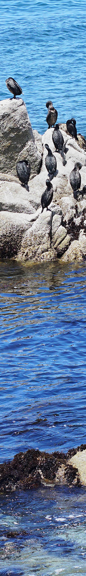 At page top an 85mm lens shot at 3PM, is a favorite rock outcrop where 29 Brandts cormorants, urile penicillatus, enjoy roosting and leaving their white droppings after returning from morning feeding. The diving into the sea cormorants unlike most aquatic birds, do not have oil insulated feathers but rather must dry out their wet feathers by sunning on such safe from predators offshore rocks.
